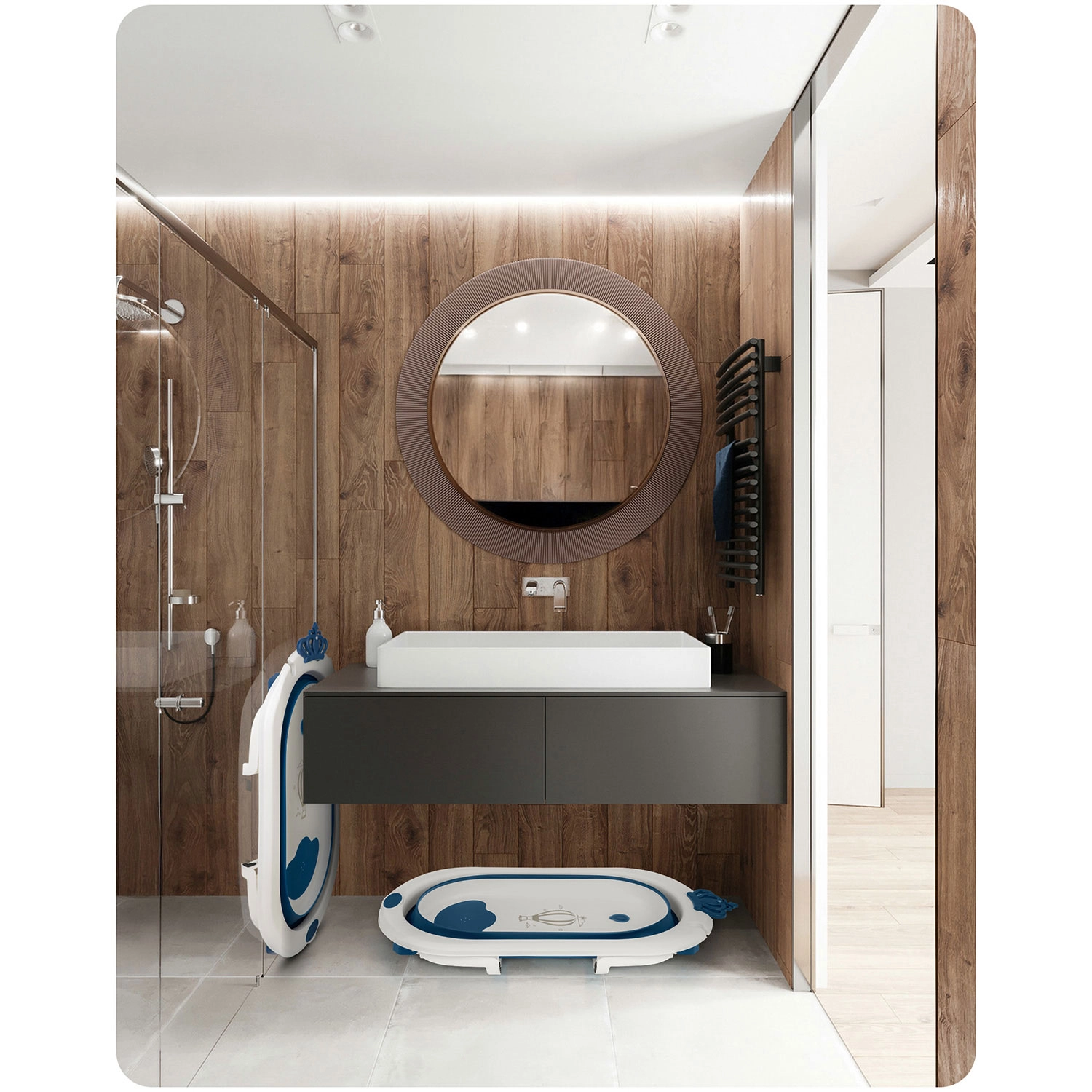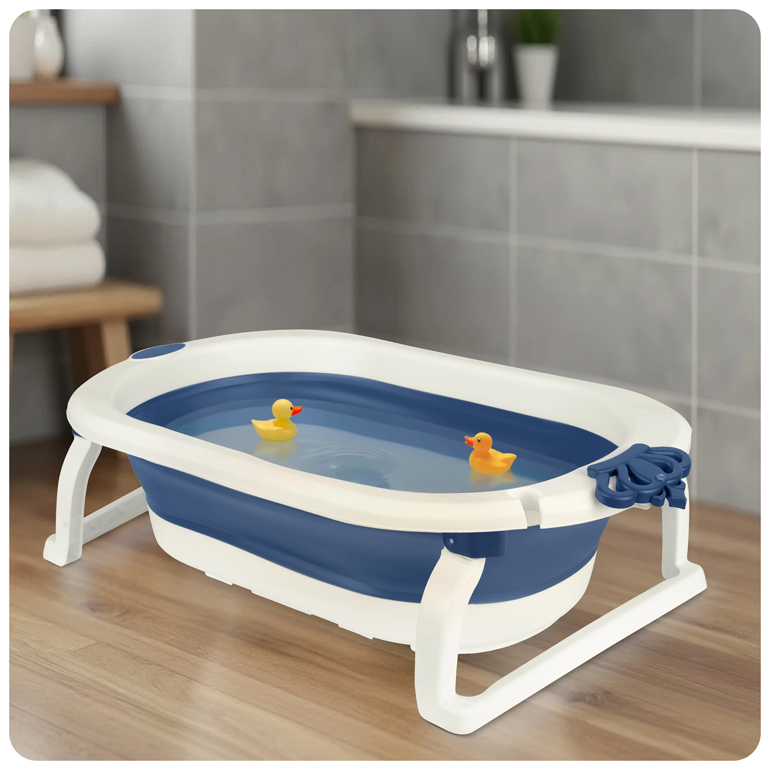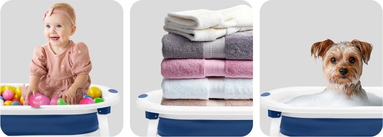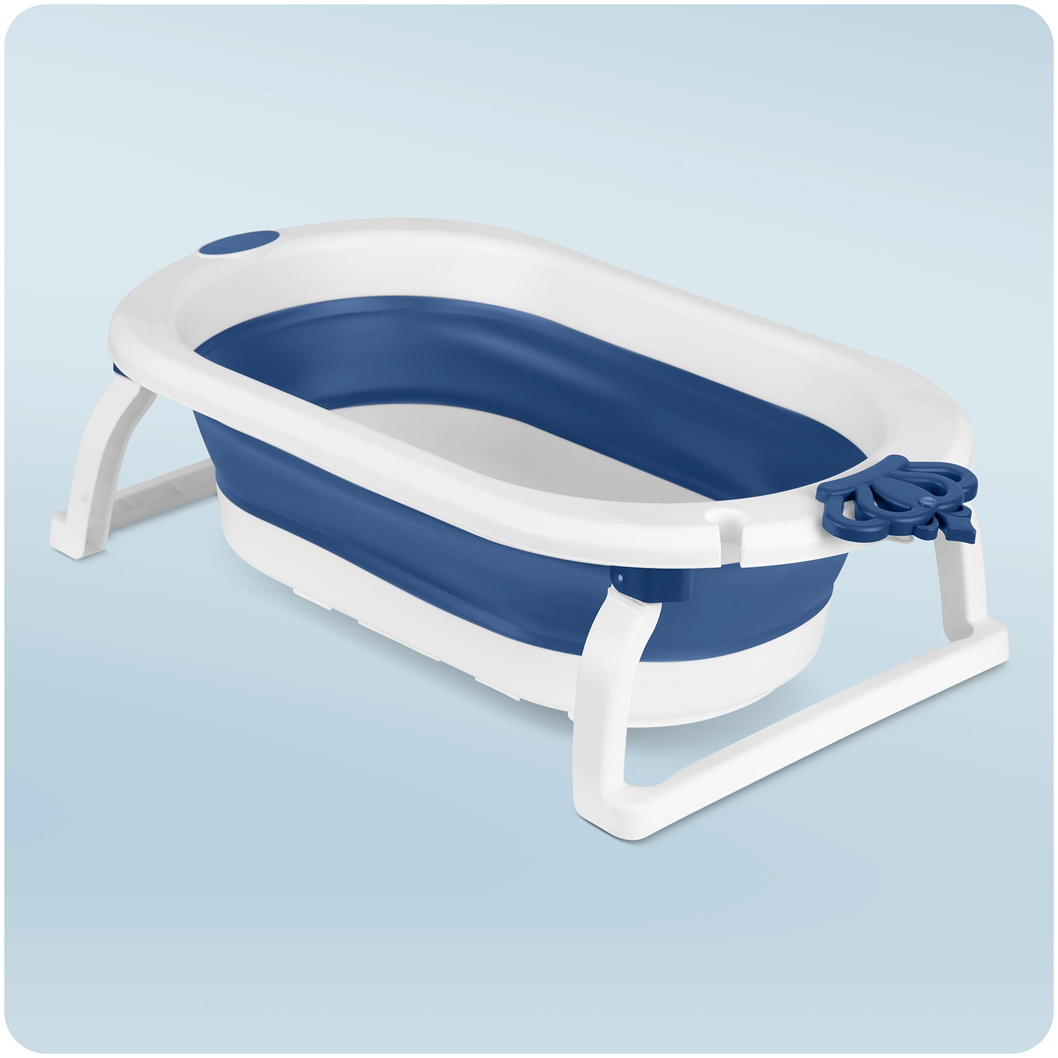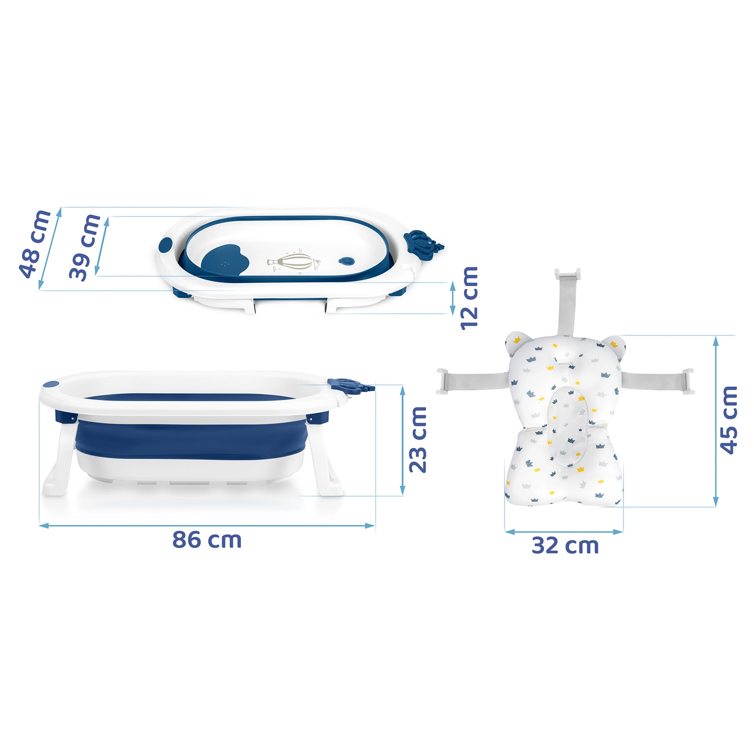 Praktyczna i bezpieczna składana wanienka dla niemowląt i starszych dzieci oferuje lekkość i kompaktowe wymiary, stabilne, składane nogi z antypoślizgiem oraz korek temperatury zmieniający kolor powyżej 38 °C. W zestawie znajduje się miękka, szybkoschnąca wkładka dla noworodków z regulowanymi paskami dla pewnego mocowania. Idealna do łazienki i w podróży – wygodne kąpiele bez chlapania dzięki uchwytowi na słuchawkę prysznicową.