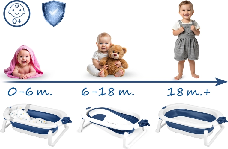 - 0–6 miesięcy z wkładką; 6–18 miesięcy bez wkładki; 18 m+ więcej przestrzeni do kąpieli