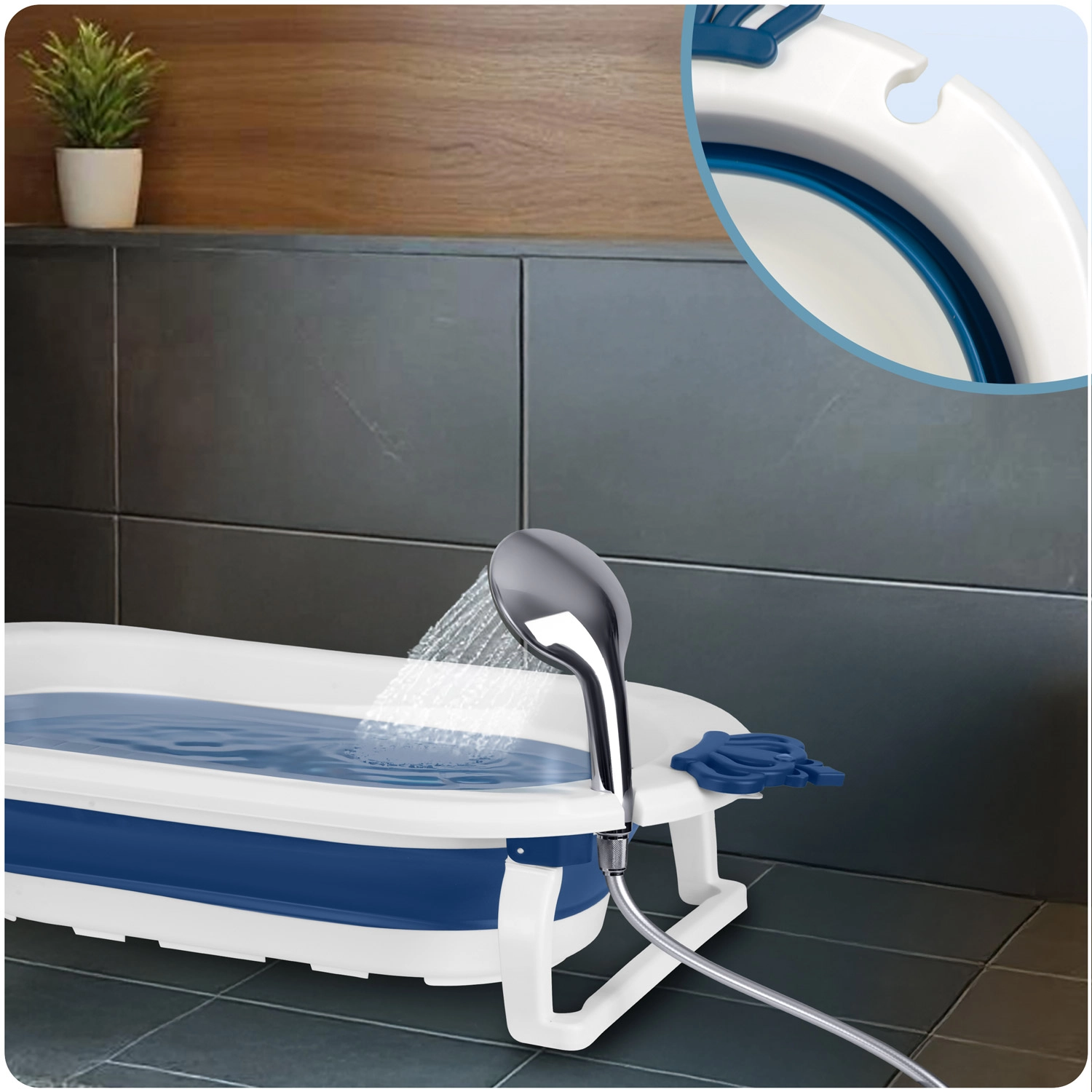 Kompaktowe wymiary po złożeniu oszczędzają miejsce w łazience i podczas podróży. Zintegrowany uchwyt na słuchawkę prysznicową ułatwia nalewanie wody bez rozpryskiwania.