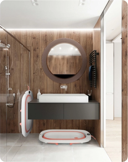 Solidna składana konstrukcja z antypoślizgowymi nóżkami gwarantuje stabilność nawet na śliskiej powierzchni. Zintegrowany uchwyt na słuchawkę prysznicową ułatwia napełnianie bez rozpryskiwania. Po kąpieli wanienkę łatwo złożysz do kompaktowego kształtu, powiesisz na oczku lub schowasz do szafki – idealna do mniejszych łazienek i w podróż.