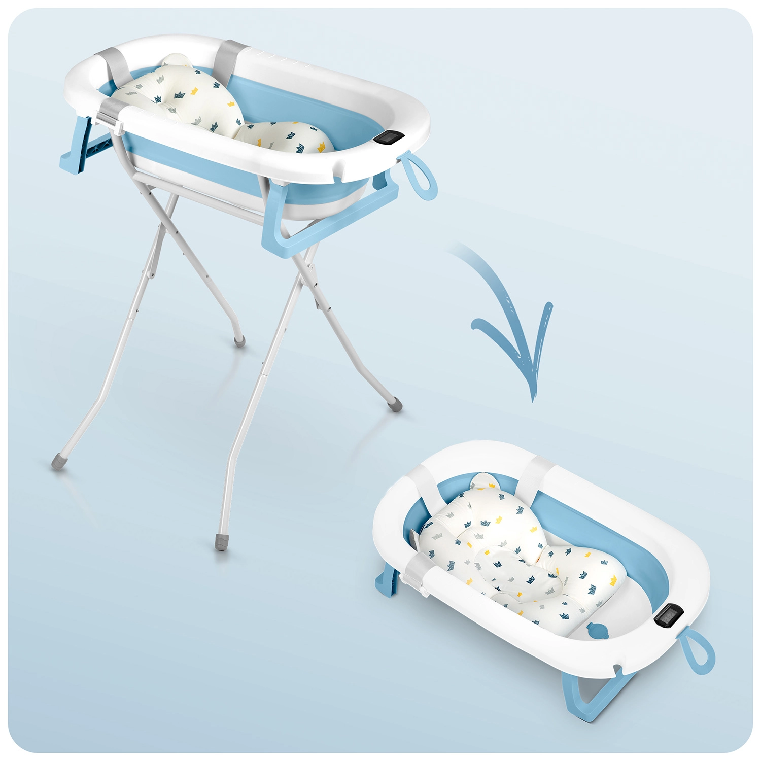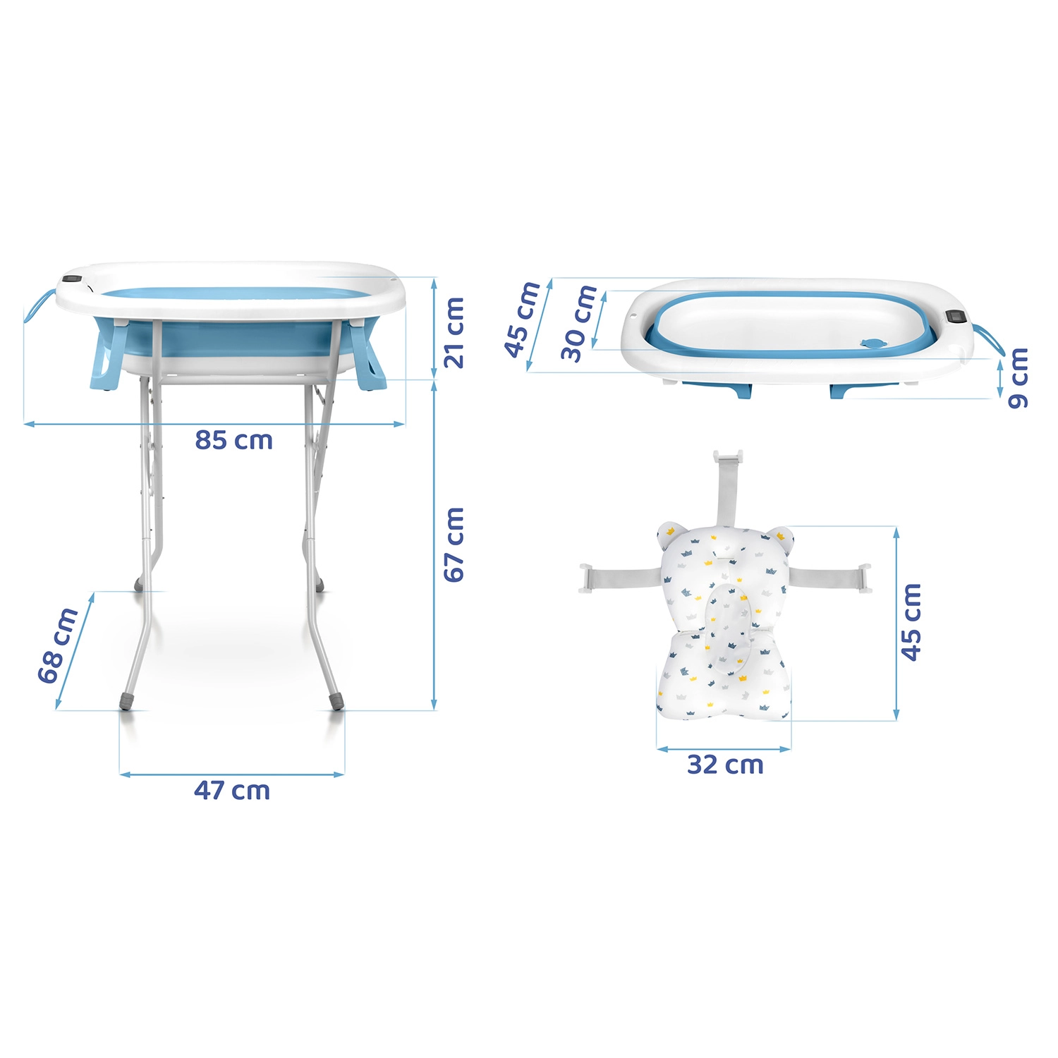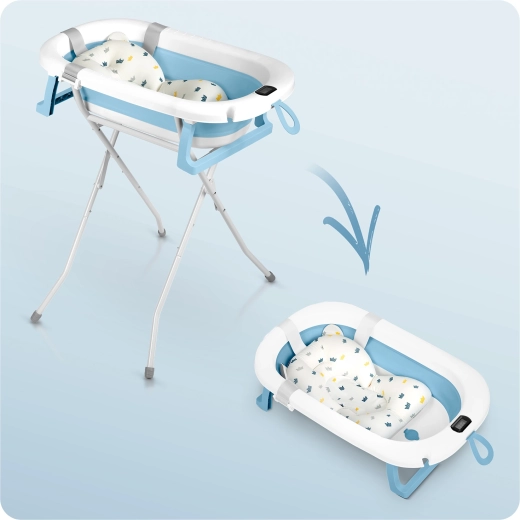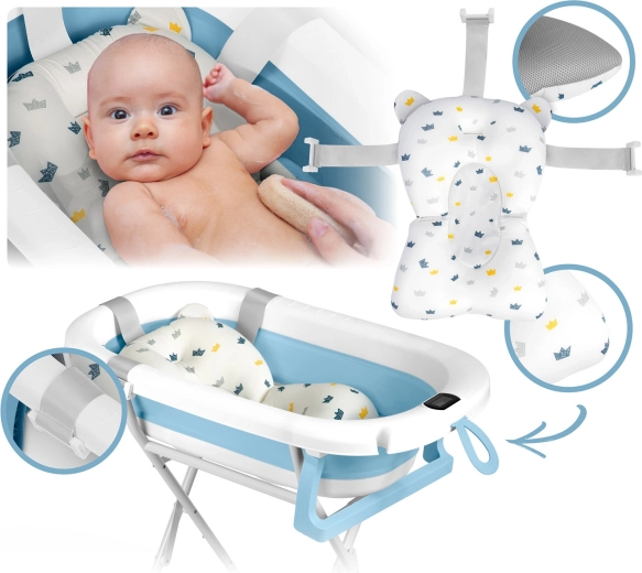Maksymalny komfort i bezpieczeństwo podczas kąpieli od pierwszych dni. Miękka, szybkoschnąca wkładka delikatnie podpiera główkę i plecy dziecka, a składany metalowy stojak unosi wanienkę do ergonomicznej wysokości. Antypoślizgowe nóżki zapewniają stabilność nawet na gładkich powierzchniach, a korek zmieniający kolor po przekroczeniu 38 °C ostrzega przed zbyt gorącą wodą.