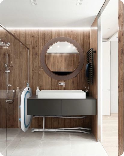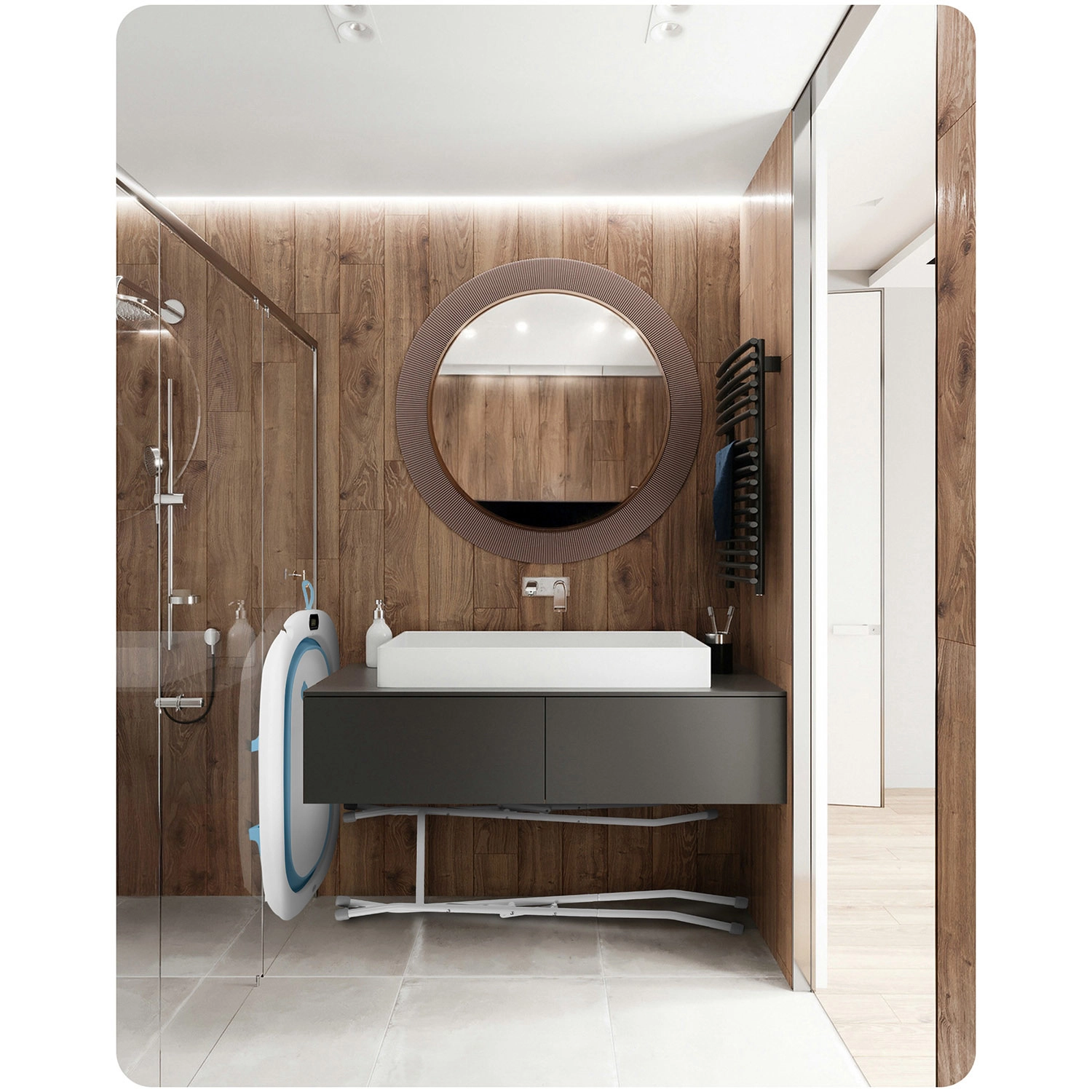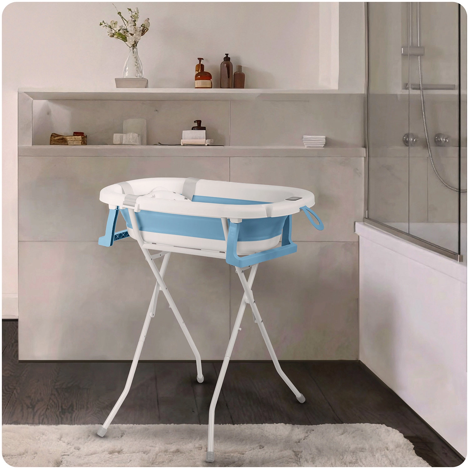 Składany metalowy stojak podnosi wanienkę do idealnej wysokości, zwiększa stabilność i odciąża plecy. Doskonałe rozwiązanie do małej łazienki i na wyjazdy.