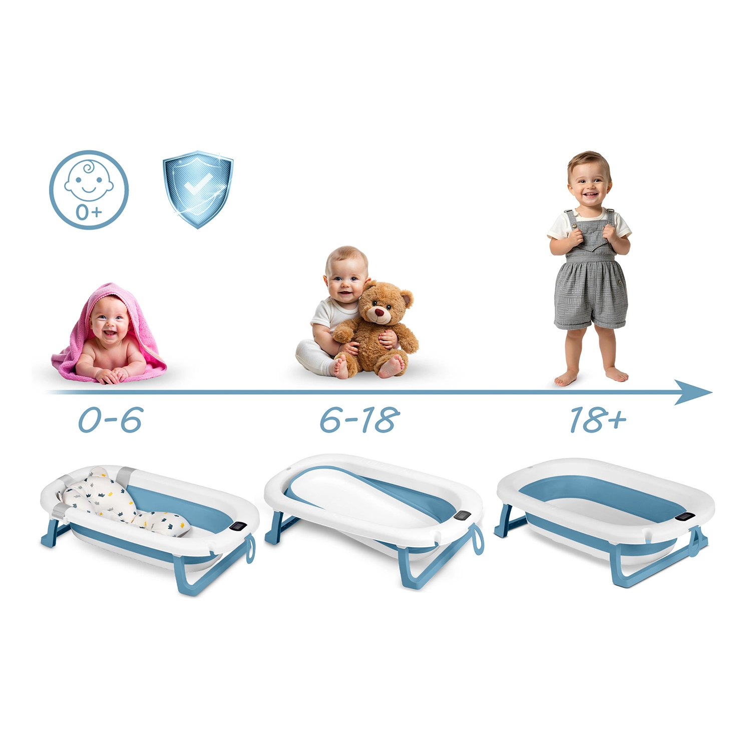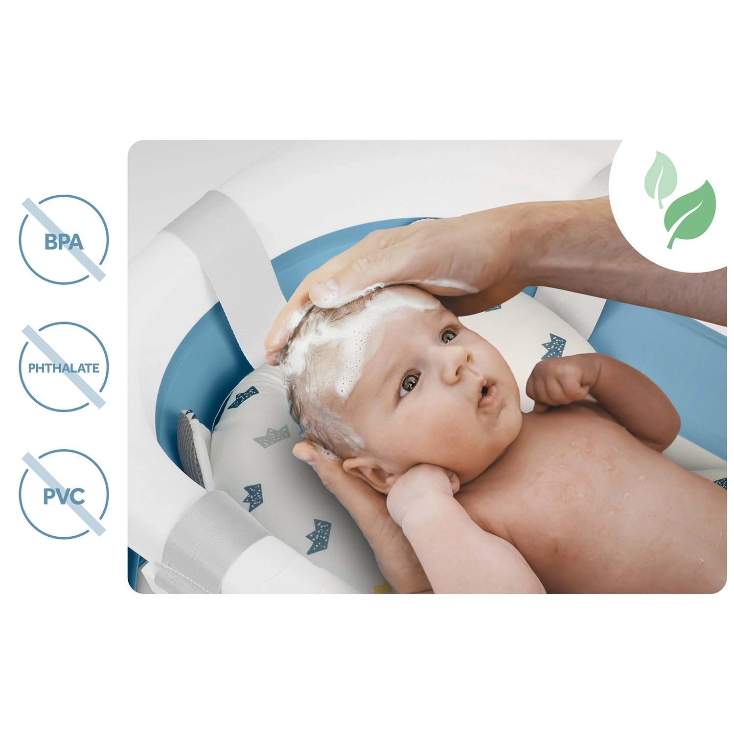 Rośnie z dzieckiem i oszczędza miejsce. Wanienka jest składana, lekka i przenośna – idealna do małej łazienki i na wyjazdy. Używaj jej z wkładką dla noworodków (0–6 m), samodzielnie na stojaku dla siedzących maluchów (6–18 m), a później jako przestronną kąpielówkę dla ciekawych świata przedszkolaków (18 m+). Materiały bez BPA spełniają rygorystyczne europejskie normy bezpieczeństwa.