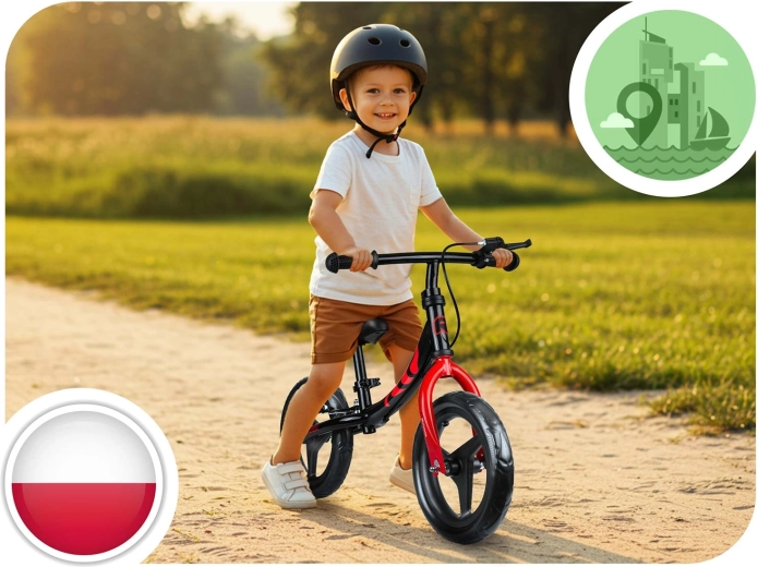 Polski projekt z dbałością o detale spełnia europejskie standardy bezpieczeństwa. Antypoślizgowe chwyty ze stopkami zapewniają pewny uchwyt, a ergonomiczne siodełko z płynną regulacją wysokości dopasowuje się do wzrostu dziecka. Tylny hamulec ułatwia bezpieczne zatrzymanie i zwiększa kontrolę nad jazdą.