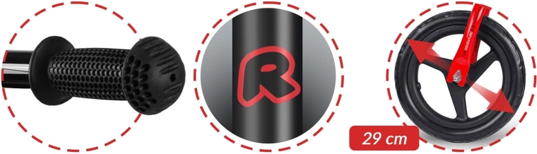 • Nieprzebijalne koła EVA 29 cm – odporne na wilgoć, UV i niskie temperatury, łatwe w czyszczeniu.
