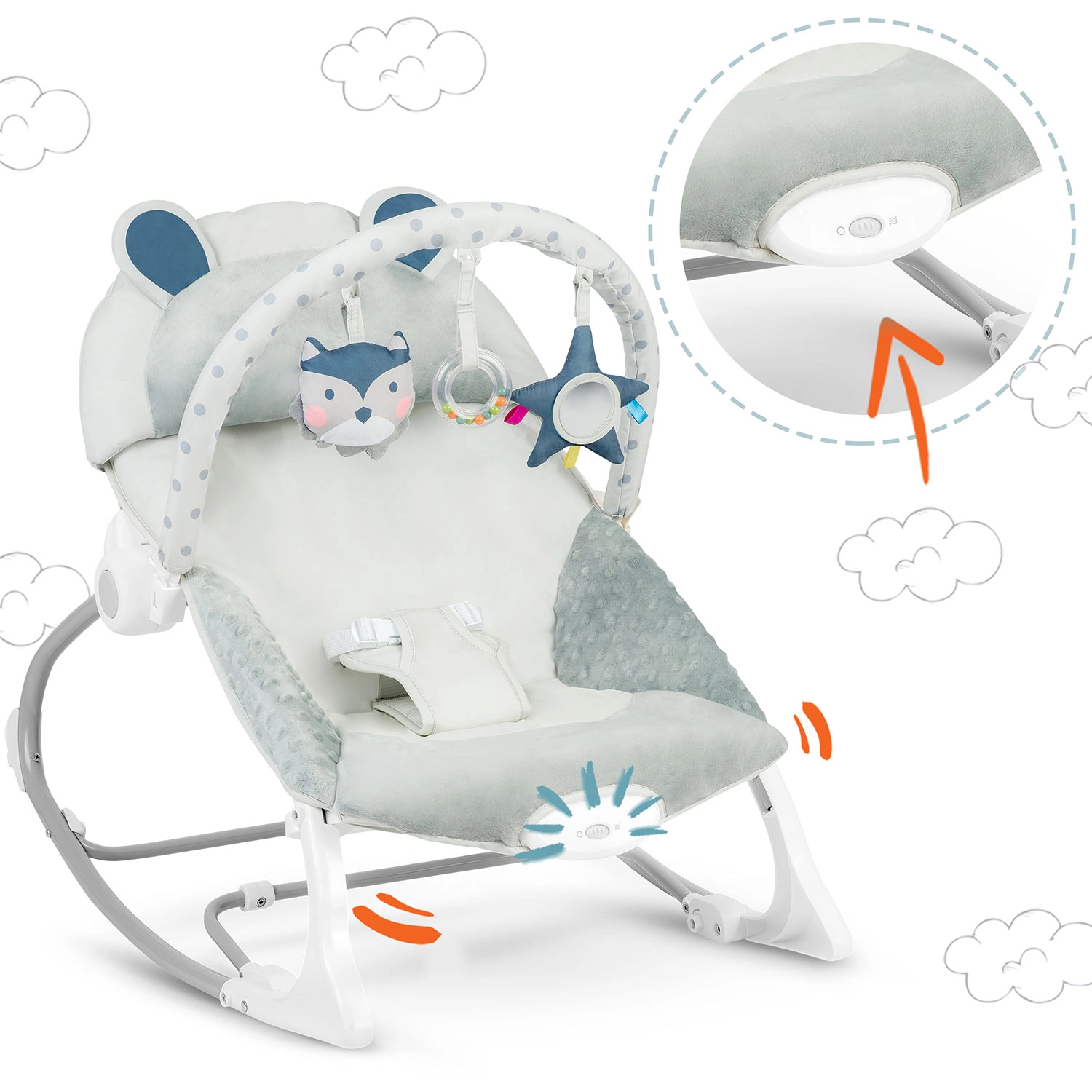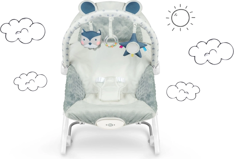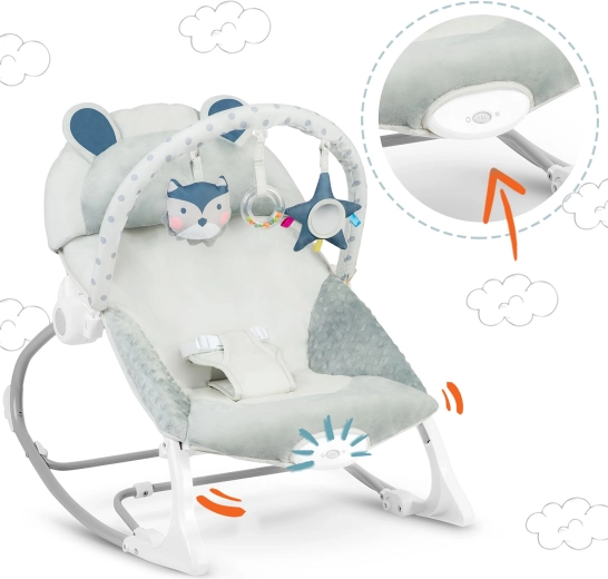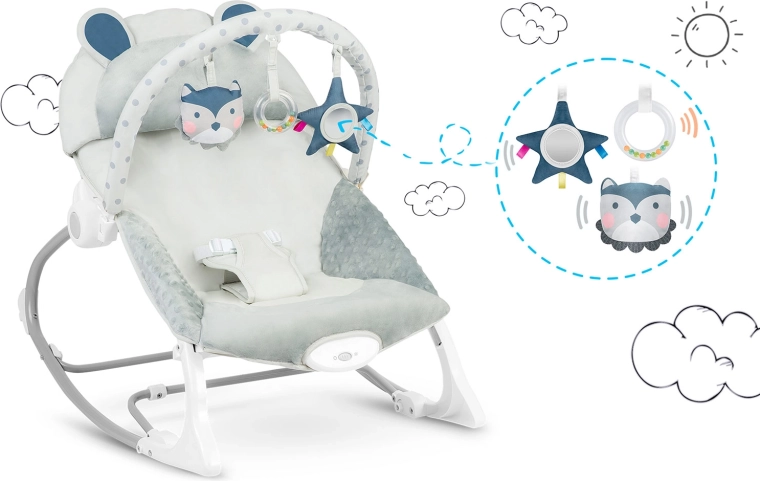 Uspokajający rytm kołysania oraz opcjonalna funkcja wibracji pomagają maluszkowi się zrelaksować i szybciej zasnąć, podczas gdy Ty masz wolne ręce na drobne obowiązki. Odpinany pałąk z szeleszczącymi pluszowymi zabawkami i kółeczkiem stymuluje wzrok i dotyk, a także łatwo go dostosować – zabawki można przekładać lub wymieniać na ulubione.