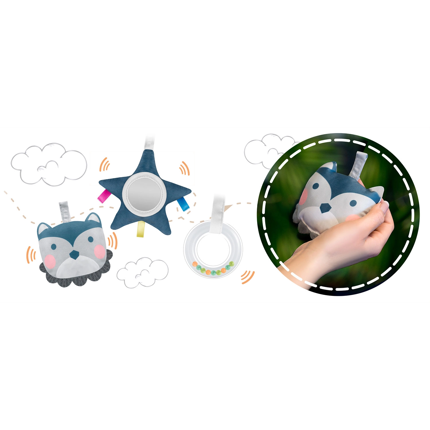 Odpinany pałąk ze szeleszczącymi zabawkami, kółeczkiem i bezpiecznym lusterkiem wspiera wzrok, dotyk i koordynację. Zabawki można łatwo przestawiać lub wymieniać.