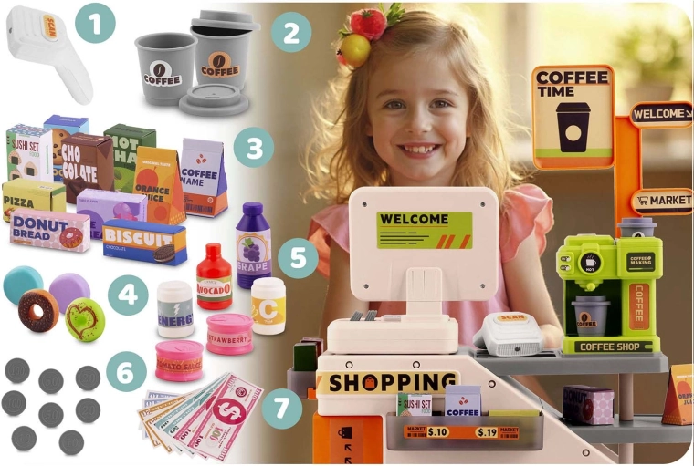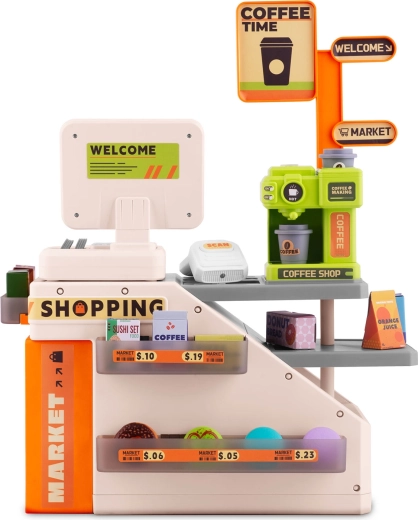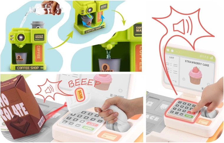 Ta kolorowa i funkcjonalna kasa z kawiarnią motywuje dzieci do odkrywania ról społecznych i rozwija wyobraźnię. Dzięki skanerowi z czerwoną diodą, przyciskom z dźwiękami oraz ekspresowi, który można napełnić wodą dla „prawdziwej” kawy, dzieci doświadczą realistycznej zabawy w sklep i kawiarnię.