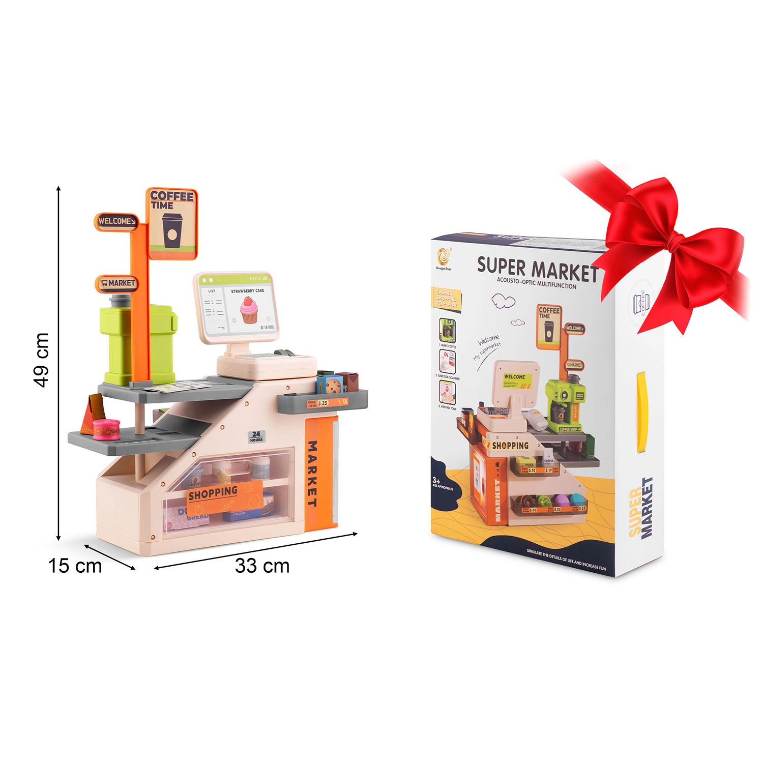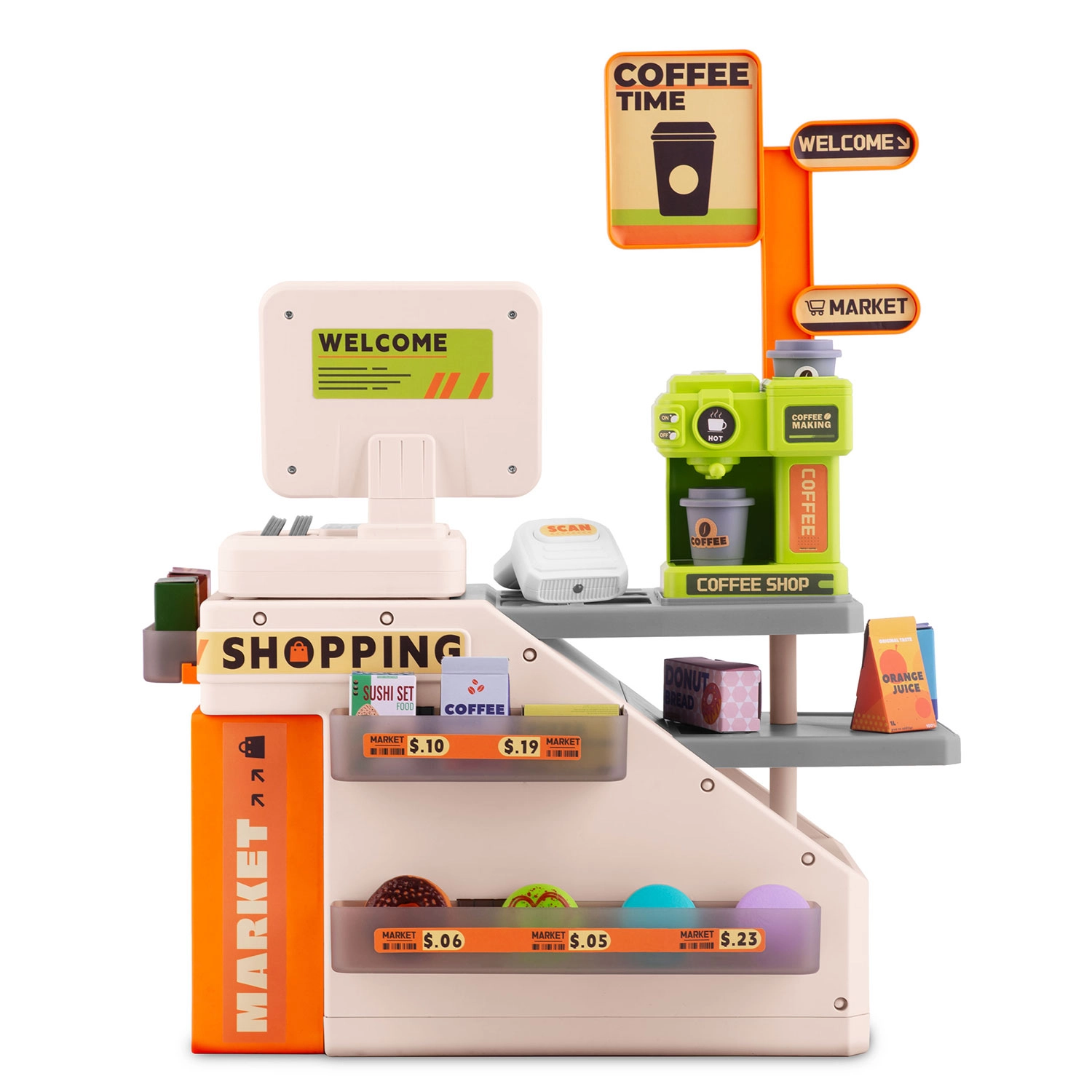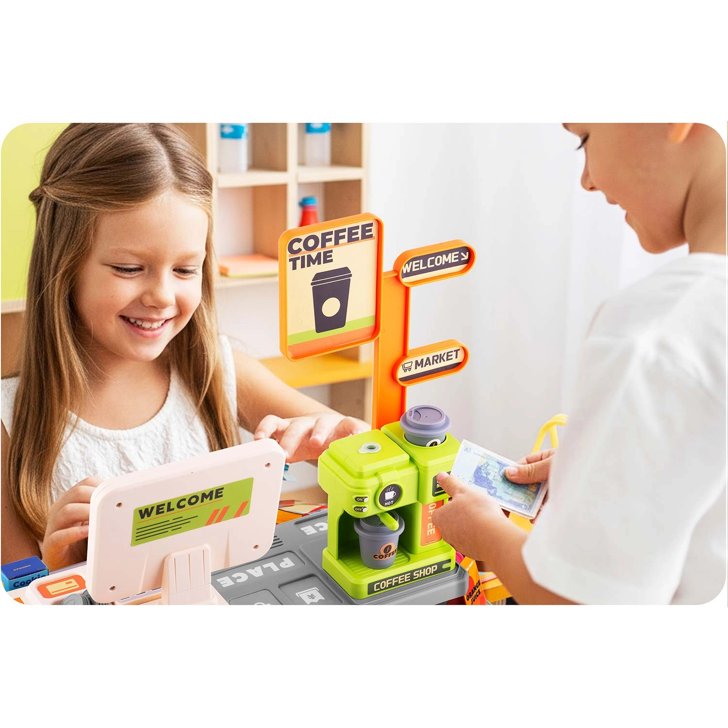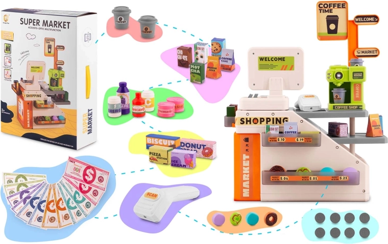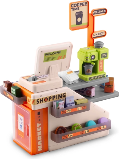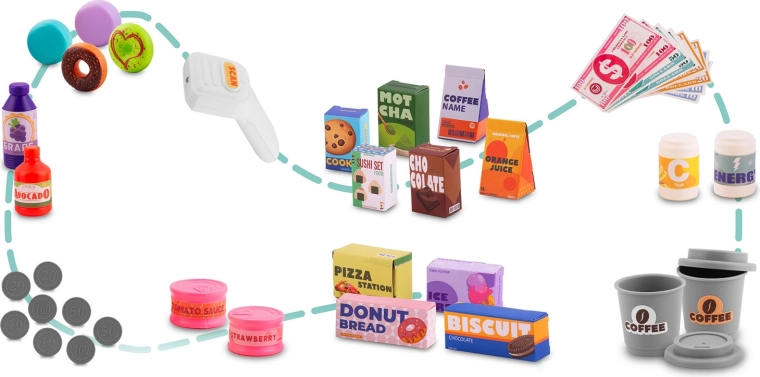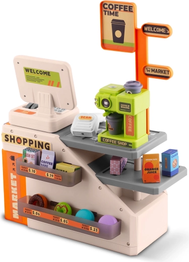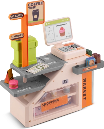 W zestawie znajduje się wiele akcesoriów: papierowe banknoty, plastikowe monety, pudełka z żywnością, ciasteczka, puszki i butelki. Otwierany blat i schowki pomagają utrzymać porządek, a wyraziste kolory i wyświetlacz kasy przyciągają uwagę i wspierają naukę przez zabawę.