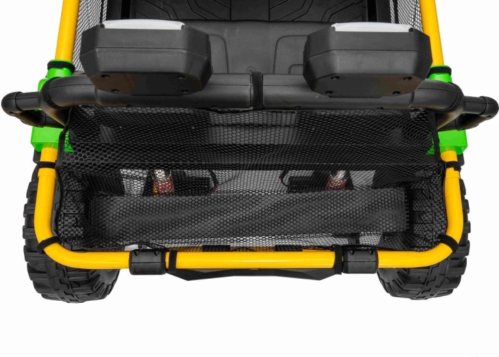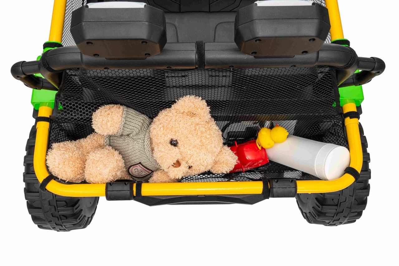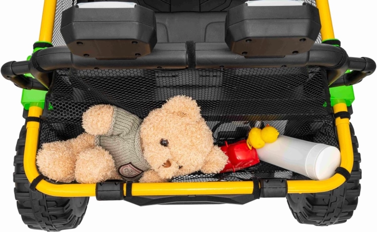 Wnętrze oferuje podwójne siedzisko z pasami, czytelny kokpit i panel audio z Bluetooth, USB i MP3. Płynny start, wybór przód/tył oraz dwie prędkości jazdy czynią podróż bezpieczną i wygodną. Tylny kosz bagażowy pomieści zabawki i przekąski w drogę.