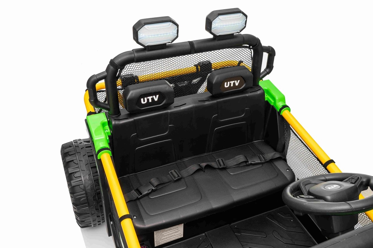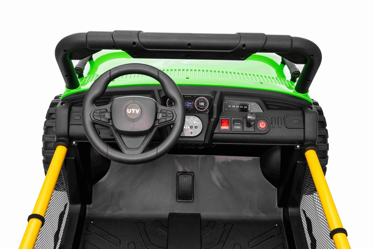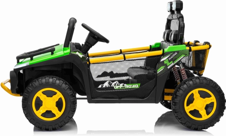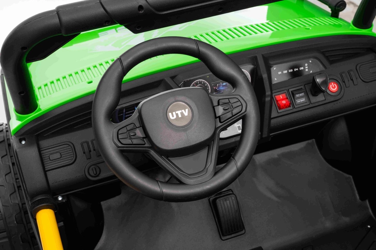 Solidny dziecięcy samochód elektryczny w stylu UTV oferuje mocny napęd 2×80 W, akumulator 24 V 9 Ah oraz terenowe koła EVA dla płynnej jazdy na zewnątrz. Dwa siedzenia z pasami bezpieczeństwa, pilot 2,4 GHz z przyciskiem Stop oraz oświetlenie LED zapewniają zabawę i bezpieczeństwo. Panel audio z Bluetooth/USB/MP3 oraz praktyczny tylny kosz dopełniają idealne wyposażenie dla małych odkrywców.