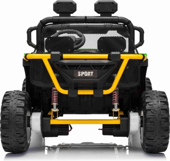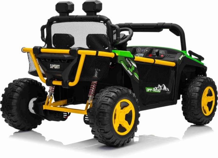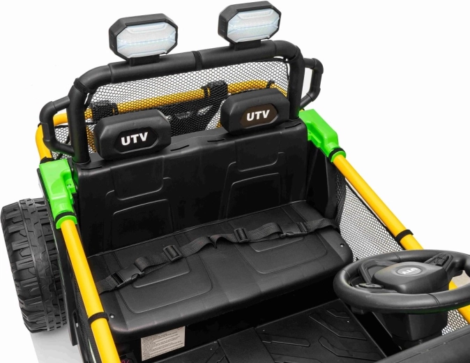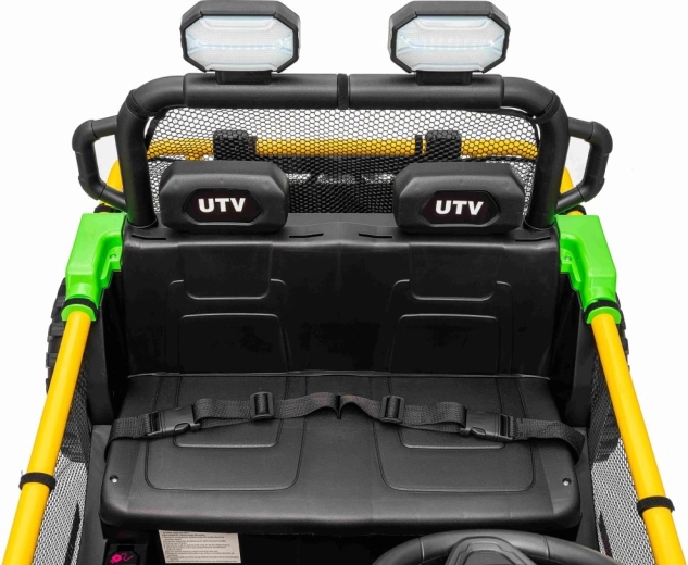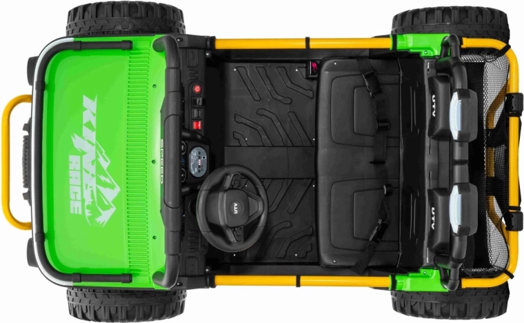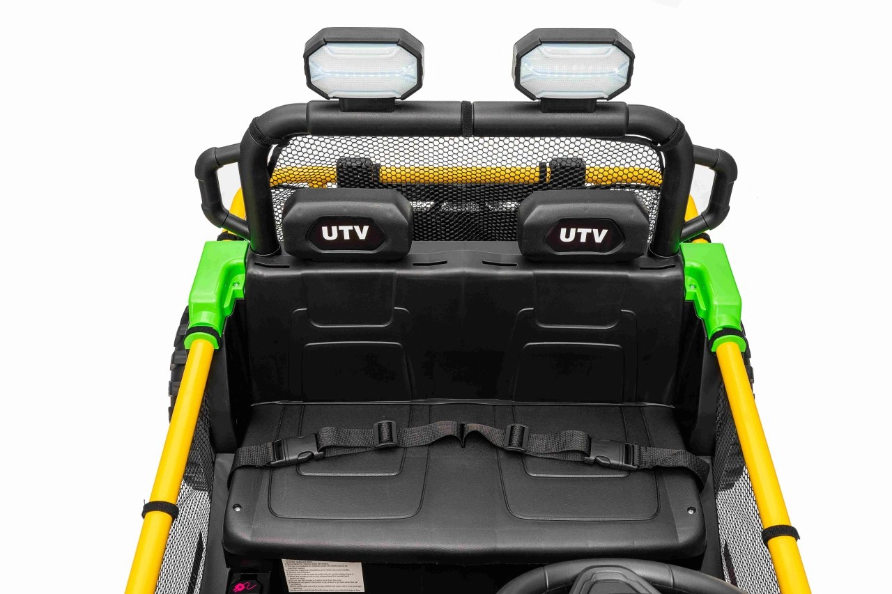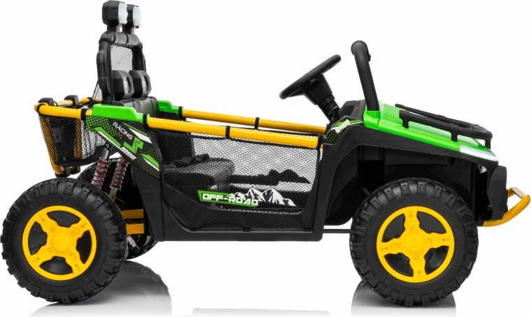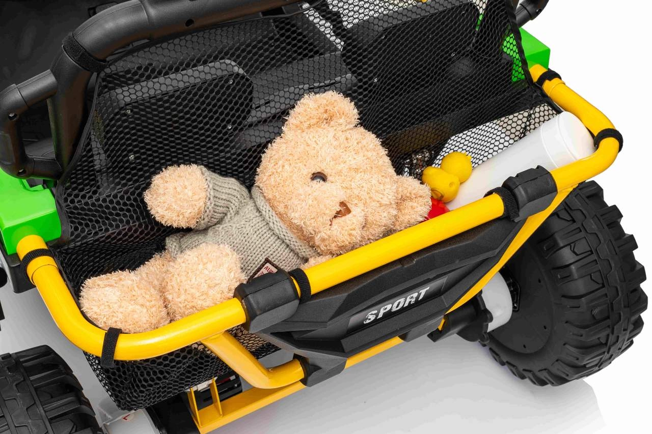 Solidny dziecięcy samochód elektryczny w stylu UTV oferuje mocny napęd 2×80 W, akumulator 24 V 9 Ah oraz terenowe koła EVA dla płynnej jazdy na zewnątrz. Dwa siedzenia z pasami bezpieczeństwa, pilot 2,4 GHz z przyciskiem Stop oraz oświetlenie LED zapewniają zabawę i bezpieczeństwo. Panel audio z Bluetooth/USB/MP3 oraz praktyczny tylny kosz dopełniają idealne wyposażenie dla małych odkrywców.