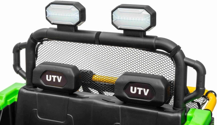 - Widoczność i styl: światła LED z przodu i na górnej belce, wyrazisty design UTV