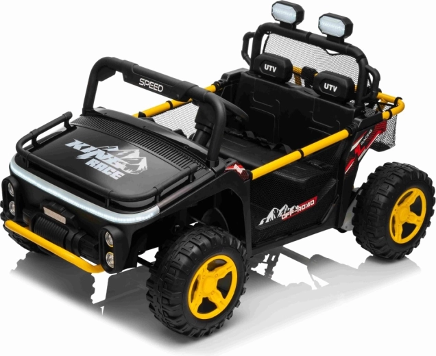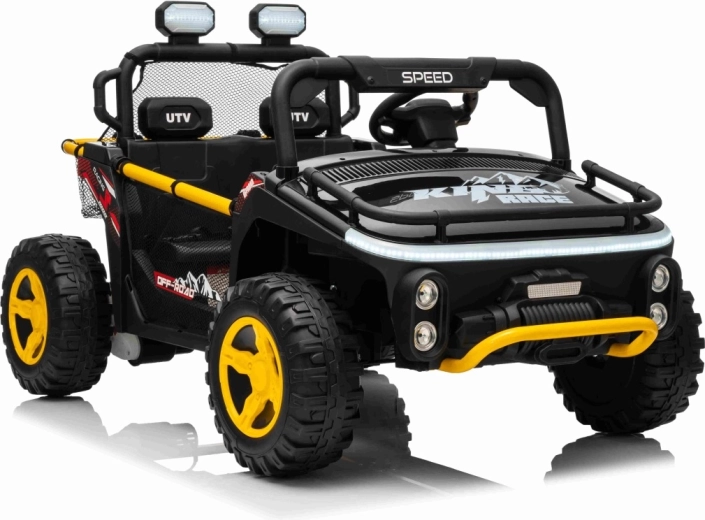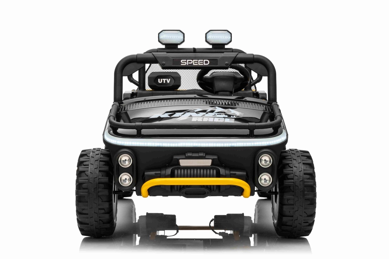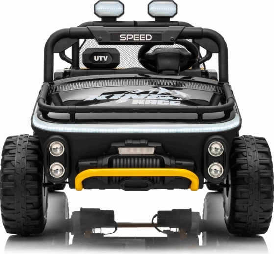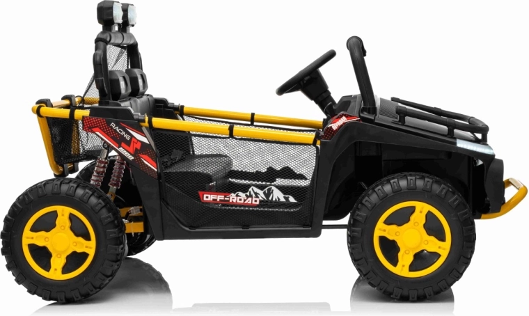 Solidny dziecięcy elektryczny samochód w stylu UTV dla dwojga dzieci oferuje mocne silniki 2x80 W, akumulator 24 V 9 Ah, miękkie koła EVA oraz niezależne zawieszenie do jazdy w terenie. Na wyposażeniu są reflektory LED, pasy bezpieczeństwa, zdalne sterowanie 2,4 GHz z awaryjnym przyciskiem Stop oraz panel multimedialny z USB, MP3 i Bluetooth.