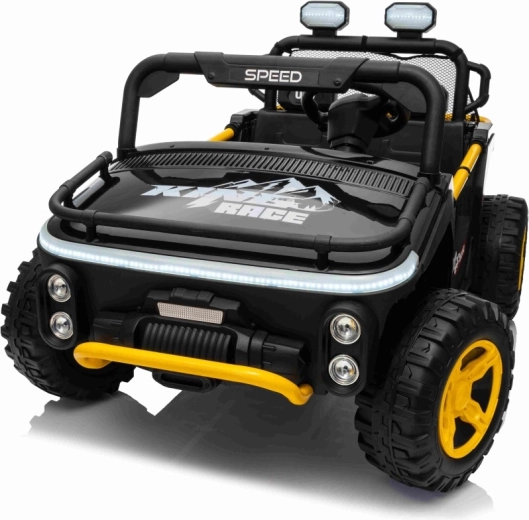 Dla bezpieczeństwa i kontroli pojazd wyposażono w zdalne sterowanie 2,4 GHz z 3 prędkościami i awaryjnym przyciskiem Stop, pasy bezpieczeństwa oraz czytelny wskaźnik naładowania. Podwójne siedzenia, wysokie prześwity podwozia (14 cm) i przestronny tylny bagażnik zapewniają miejsce także na dłuższe wycieczki. Przednie światła LED i górny pałąk świetlny poprawiają widoczność i nadają atrakcyjny wygląd.