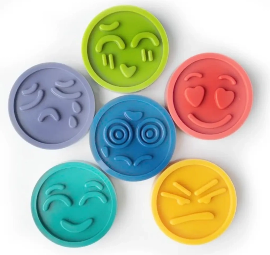 Sześć wyrazistych krążków z buźkami emocji pomaga dzieciom rozpoznawać i nazywać uczucia – to podstawa rozwoju empatii i umiejętności społecznych.