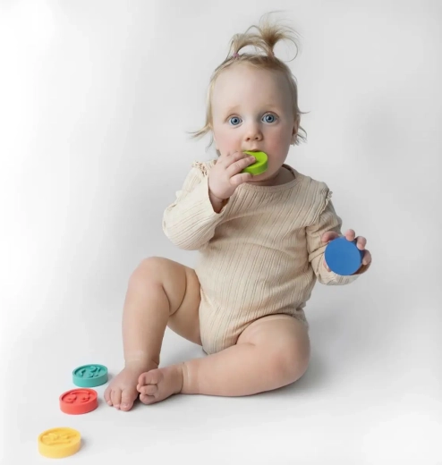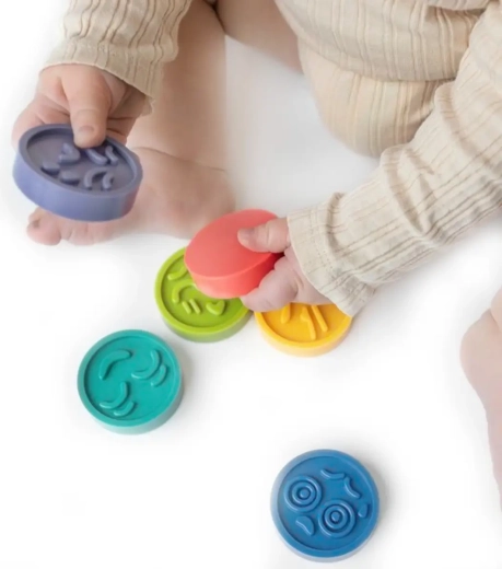 Miękkie, elastyczne dyski z bezpiecznego materiału bez szkodliwych substancji świetnie się trzyma, ściska i układa. Manipulowanie krążkami wzmacnia koordynację ręka–oko, trenuje chwyt i precyzyjne ruchy. Dzięki konstrukcji bez otworów w środku nie gromadzi się woda, dlatego doskonale sprawdzą się także podczas zabawy w kąpieli.