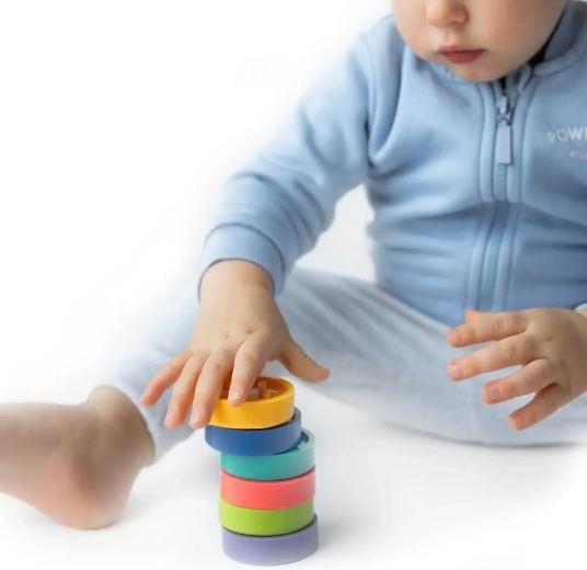 Łatwe do chwytania dyski dzieci układają w wieżę, przekładają i ściskają – tym samym trenują chwyt, koordynację ręka–oko i precyzję ruchów.