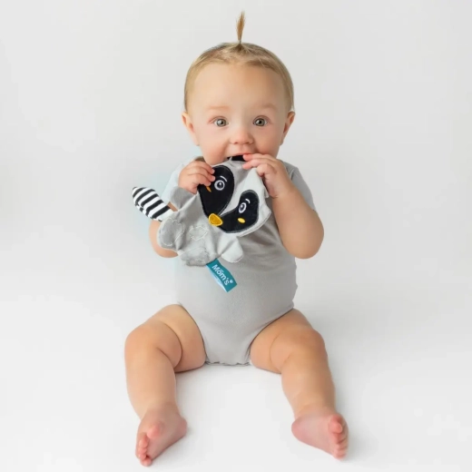 Szeleszczący szop Pedro od Mom's Care to mięciutka zabawka sensoryczna dla niemowląt od urodzenia, która rozwija wzrok, słuch i dotyk. Kontrastowe czarno-białe elementy wspierają percepcję, szeleszcząca folia przynosi kojący dźwięk, a różne faktury zachęcają do chwytania i treningu małej motoryki.