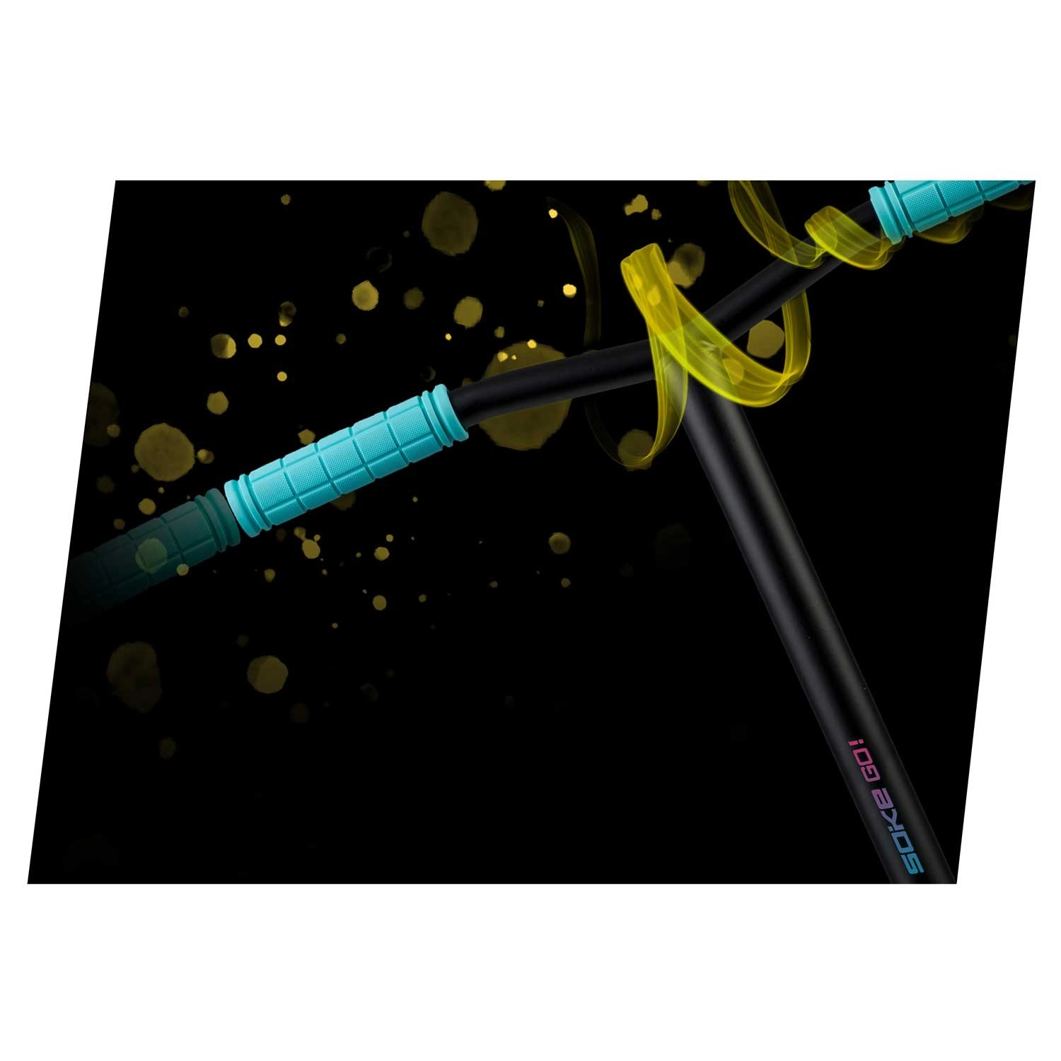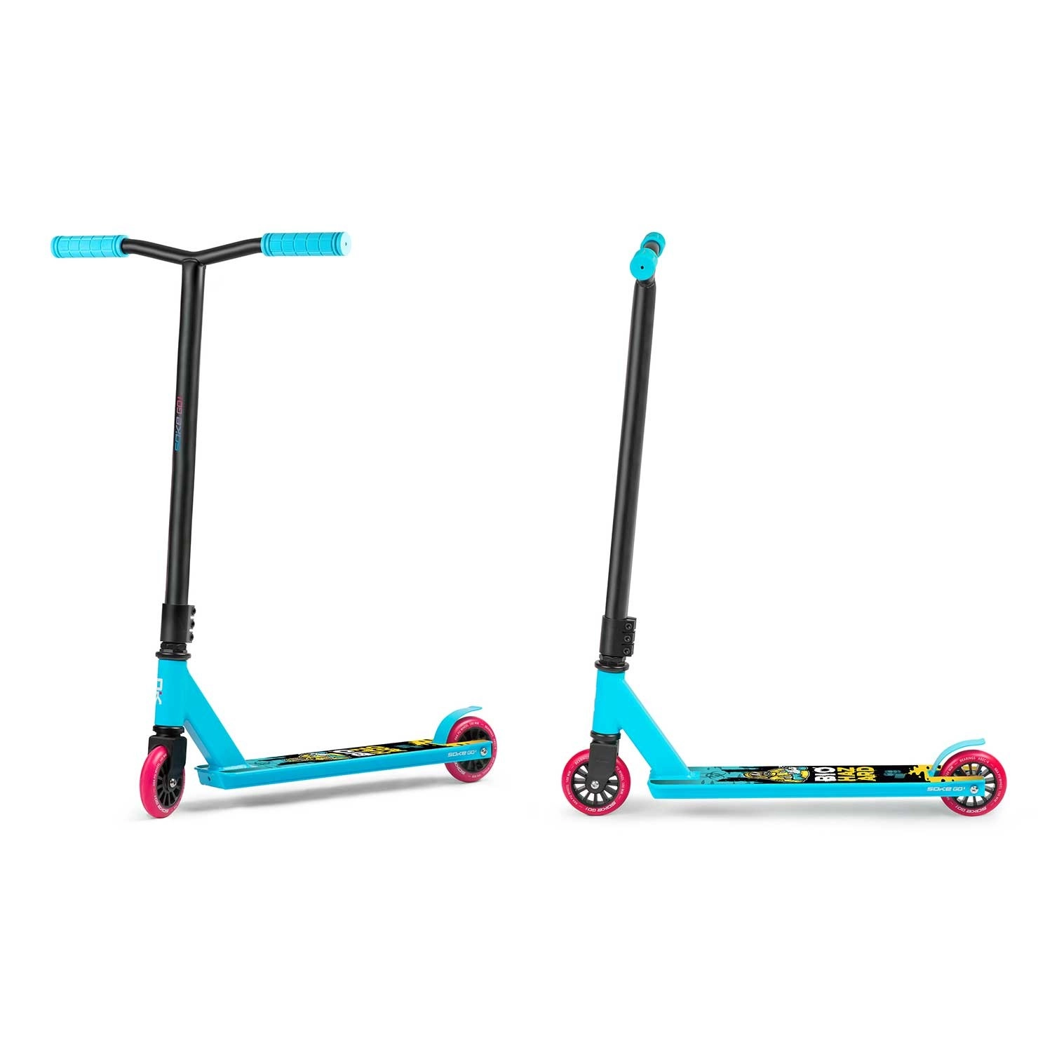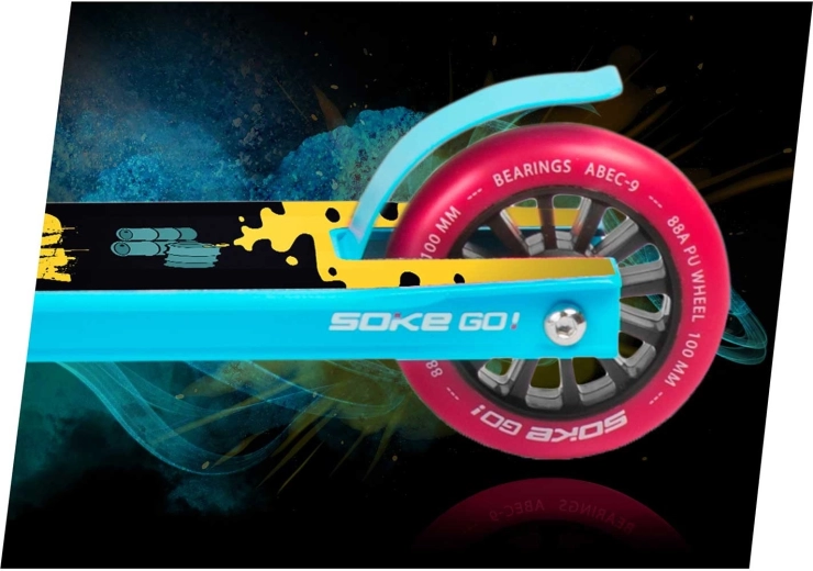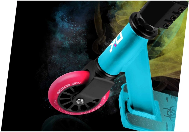 Model SOKE GO! w turkusowym kolorze został zaprojektowany dla pewności przy trikach, szybkiej akceleracji i długiej żywotności. Szeroka kierownica Y z wygodnymi gripami TPR 145 mm daje znakomitą stabilność, a sztywna aluminiowa potrójna obejma trzyma wszystko mocno w ryzach. Niska waga 2,9 kg pomaga przy whipach i spinach.