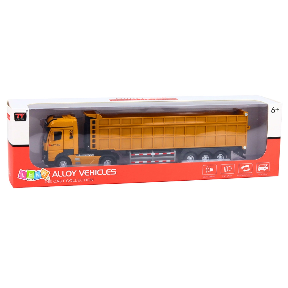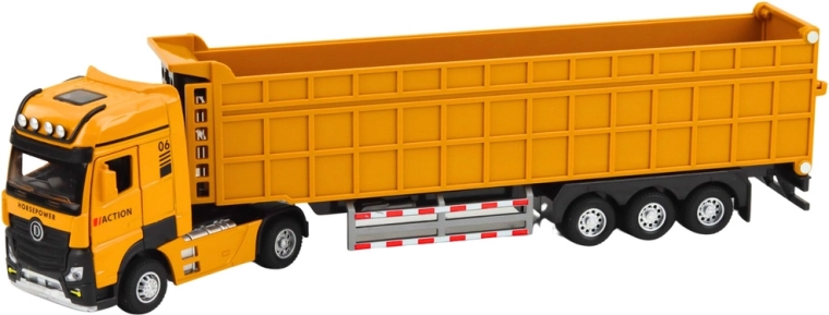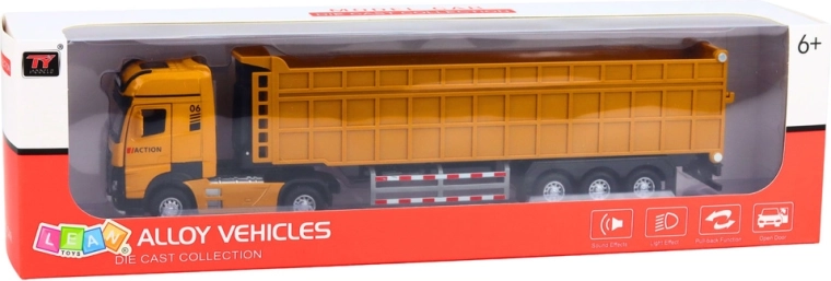 Realistyczny zestaw wywrotki dla dzieci oferuje metalową kabinę, gumowe opony oraz efekty świetlne i dźwiękowe. Dzięki napędowi typu pull-back rusza bez pilota czy baterii do jazdy, a podnoszona skrzynia ładunkowa umożliwia łatwe załadunki i wyładunki. Świetny wybór dla małych miłośników maszyn budowlanych i kreatywnej zabawy.