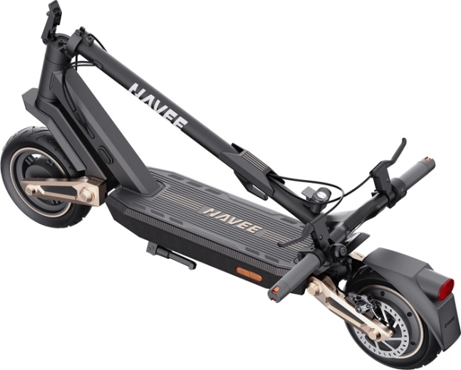 Bezdętkowe opony 10" z warstwą żelu lepiej opierają się przebiciom, szeroka kierownica i ergonomiczny kąt 5° zmniejszają zmęczenie dłoni, a poszerzony podest zwiększa stabilność. Inteligentne wyposażenie obejmuje Apple Find My, automatyczne odblokowanie/blokadę w zależności od bliskości telefonu oraz sterowanie w aplikacji NAVEE – w tym statystyki jazd, rekuperację czy automatyczne włączanie świateł.