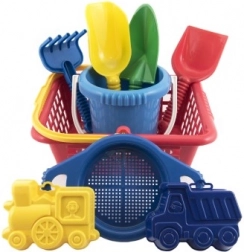 Wesoły dziecięcy zestaw do piasku z praktycznym koszykiem zawiera wszystko, co potrzebne do zabawy na plaży i w piaskownicy: wiaderko, łopatkę, szpadel, grabki, sitko i 2 foremki. Lekki wytrzymały plastik jest odpowiedni dla dzieci od 12 miesięcy i wspiera małą motorykę i wyobraźnię.