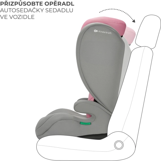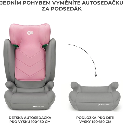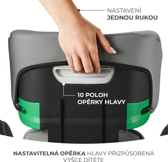 Zagłówek wyregulujesz jedną ręką w 10 poziomach. Dla starszych dzieci (140–150 cm) można odpiąć oparcie i używać wygodnego, zatwierdzonego siedziska.