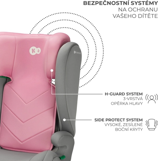Ochronę zapewnia połączenie systemów H-GUARD (3-warstwowy zagłówek) i SPS (wzmocnione osłony boczne), które pomagają pochłaniać energię uderzenia i chronić głowę, kark, ramiona oraz kręgosłup dziecka. Zagłówek wyregulujesz jedną ręką w 10 poziomach, dzięki czemu fotelik rośnie wraz z dzieckiem. Dla wyższych dzieci można odłączyć oparcie i stworzyć siedzisko 140–150 cm z potwierdzoną zgodnością z R129.