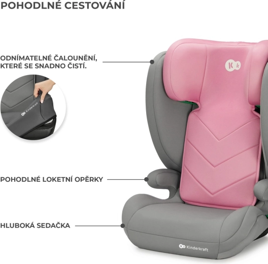 Komfort dopełniają głębokie siedzisko z miękką tapicerką, podłokietniki dla ergonomicznej pozycji oraz zdejmowany, nadający się do prania pokrowiec. Prowadzenie pasa przez prowadnice przy głowie i pod podłokietnikiem ułatwia prawidłowe zapięcie. Praktyczne materiały: skorupa z HDPE, tapicerka z poliestru – trwałe i łatwe w utrzymaniu.