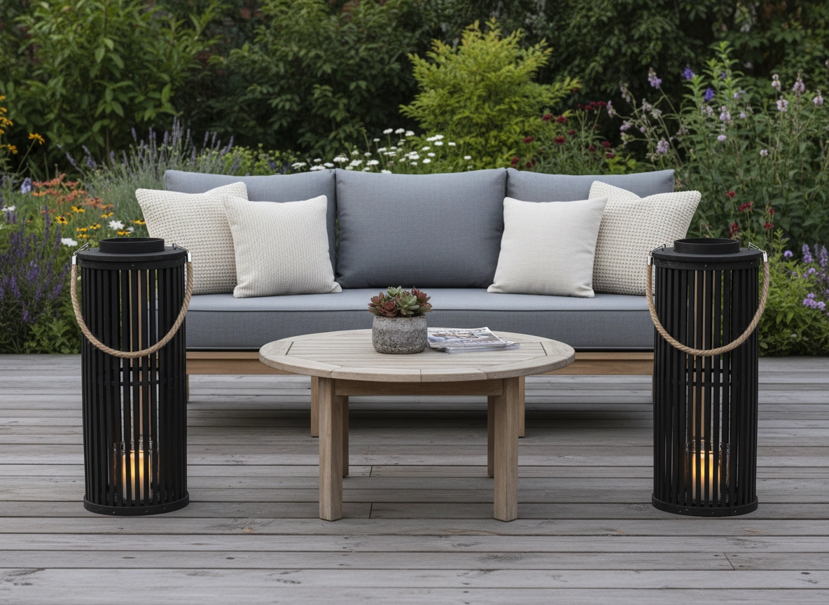 Duży czarny lampion to wyrazisty dodatek na taras, do ogrodu i salonu. Dzięki szklanej wkładce świeca jest chroniona, a światło przyjemnie rozprasza się między lamelami. Design świetnie prezentuje się we wnętrzach nowoczesnych, rustykalnych i boho.