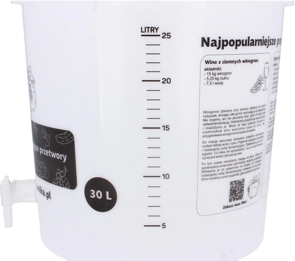 Wytrzymałe wykonanie z plastiku jest odpowiednie do kontaktu z napojami fermentującymi i ułatwia czyszczenie oraz konserwację. Wiadro jest świetną bazą każdego domowego zestawu do fermentacji – pozwala skupić się na rezultacie, a nie na problemach technicznych.