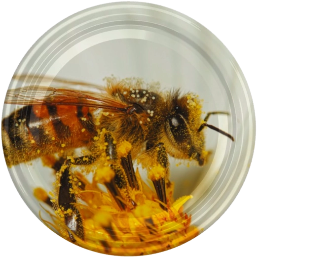 Praktyczne wieczko do słoików o średnicy fi66 z atrakcyjnym motywem dużej pszczoły na kwiacie jest idealne na miód oraz domowe przetwory. Niezawodnie zamyka zawartość, wspiera świeżość i swoim kuszącym designem przyciąga uwagę każdego klienta.