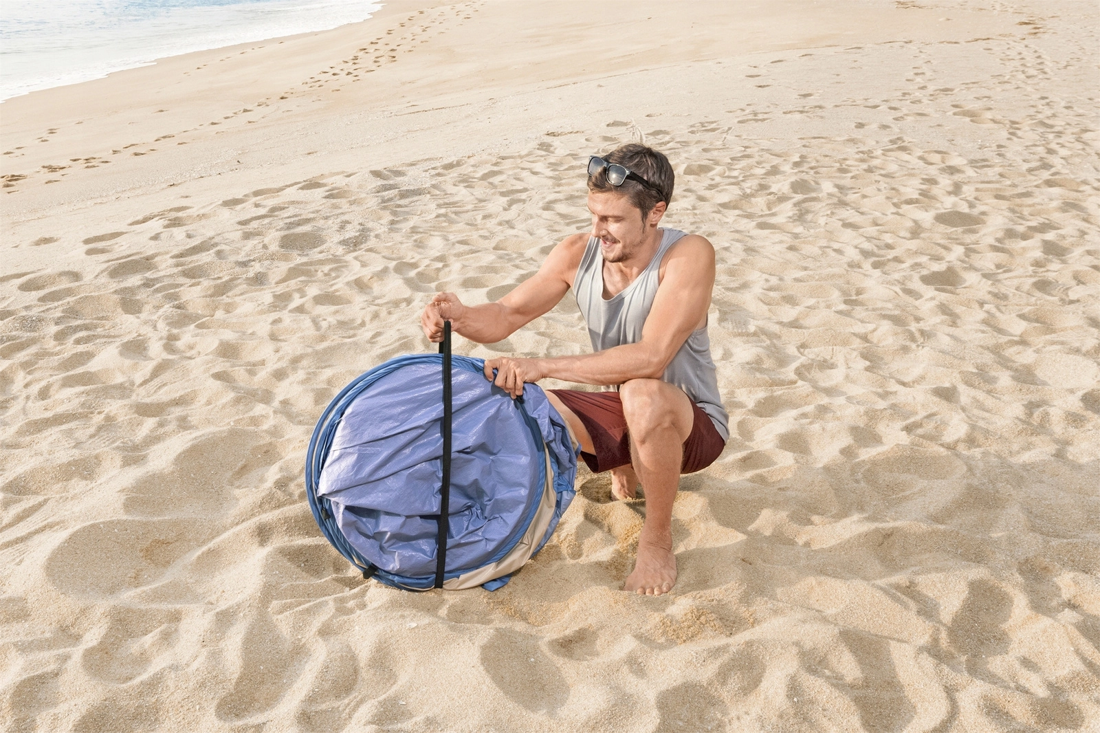 Ciesz się wygodą na plaży, nad jeziorem i w ogrodzie. Namiot plażowy BESTWAY Beach Quick 2 łączy ultraszybkie rozkładanie, niską wagę i stabilną konstrukcję z włókna szklanego. Szerokie wejście i okna z siatki zapewniają świetną cyrkulację powietrza, a zintegrowana podłoga tworzy czyste i komfortowe miejsce do relaksu.