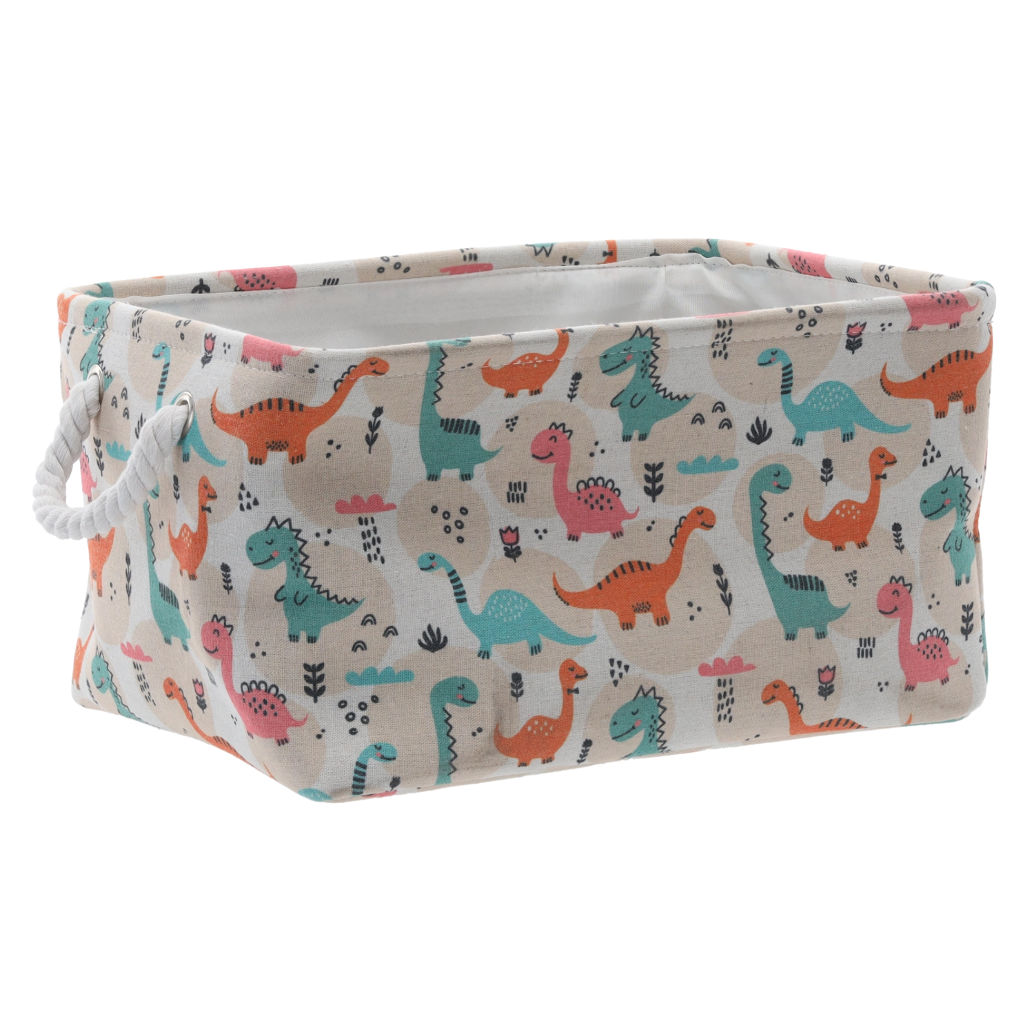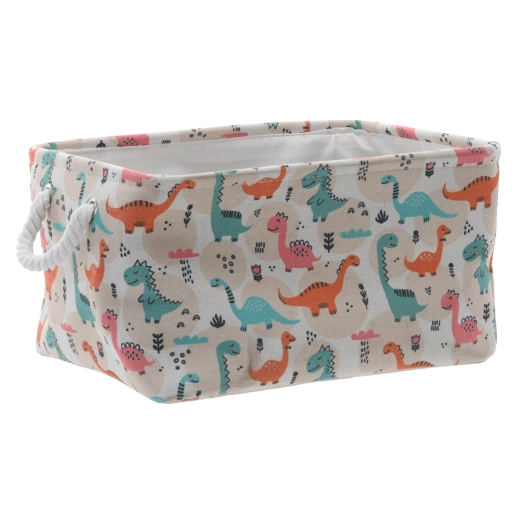 Utrzymaj pokój dziecięcy przejrzysty i przytulny dzięki tekstylnemu koszowi z radosnym nadrukiem dinozaurów w pomarańczowych, zielonych i różowych tonach na jasnym tle. Kosz jest lekki, ale stabilny dzięki wzmocnionym krawędziom i pasuje do pokoju dziecięcego, bawialni oraz przedszkola.