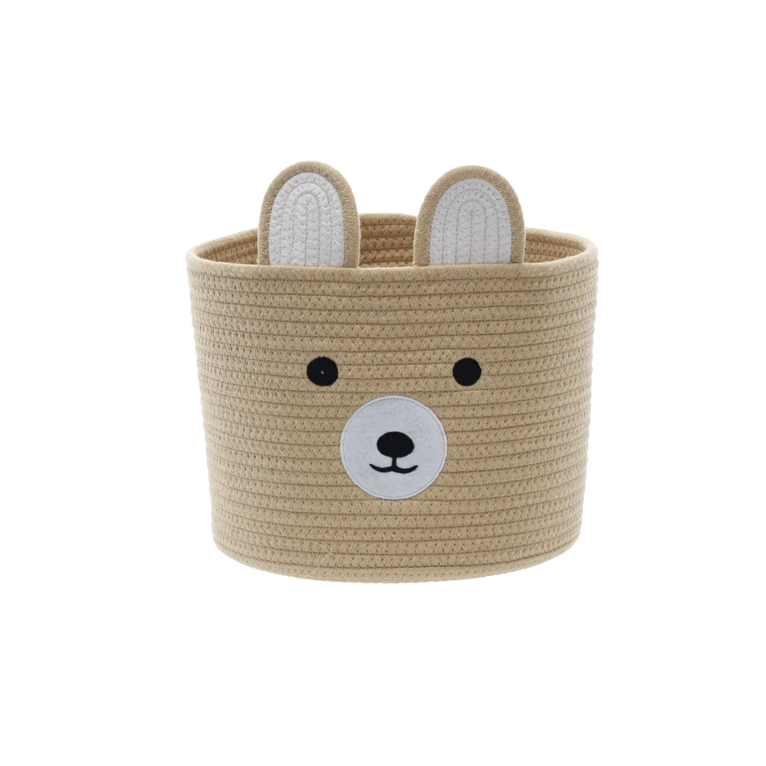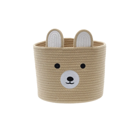 Elegancki beżowy kosz z uroczą buźką misia i uszkami to dekoracyjny i funkcjonalny dodatek do domu. Jest idealny do organizacji zabawek, drobnych ubrań lub dziecięcych akcesoriów, a dzięki miękkiej tekstylnej konstrukcji jest bezpieczny i przyjazny dla dzieci.