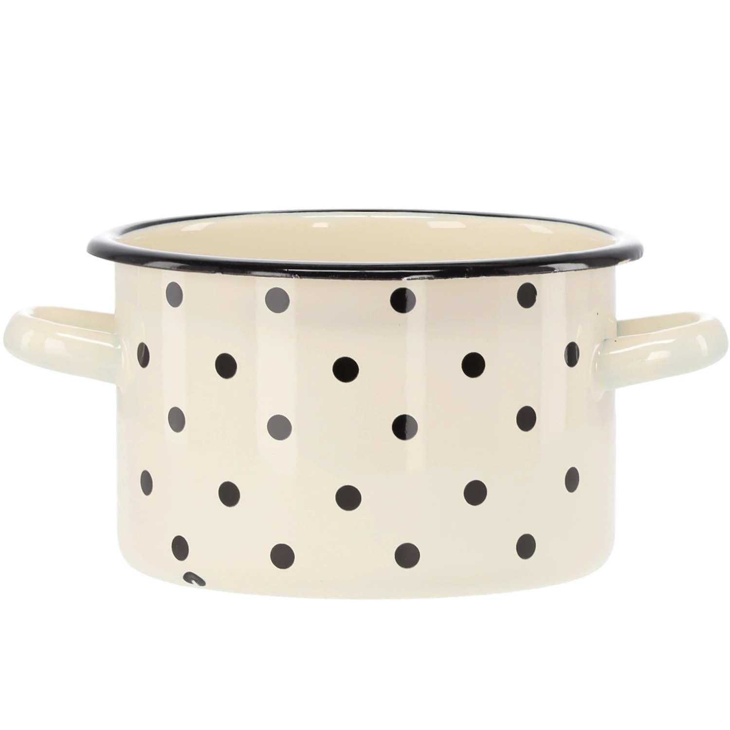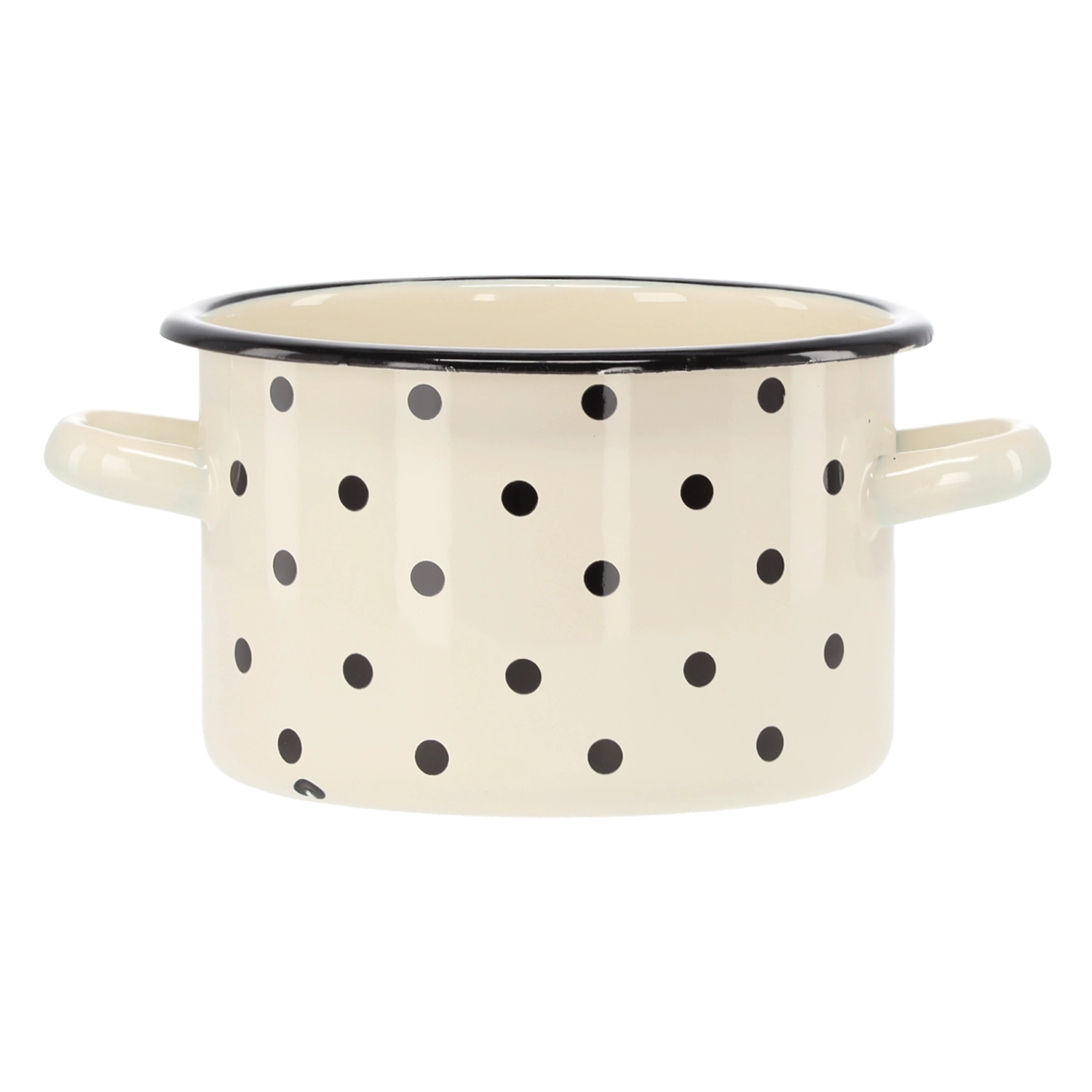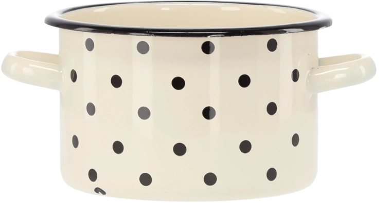 Emaliowany garnek o pojemności 2 litry jest idealny do przygotowywania zup, sosów czy podgrzewania potraw. Klasyczny biały design z ponadczasowym wzorem kropek wpasuje się w każdą kuchnię i doda jej stylowego charakteru.