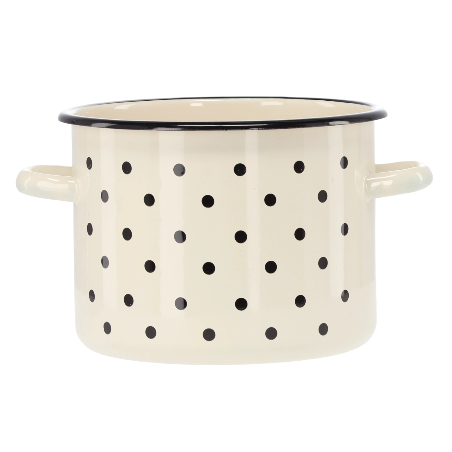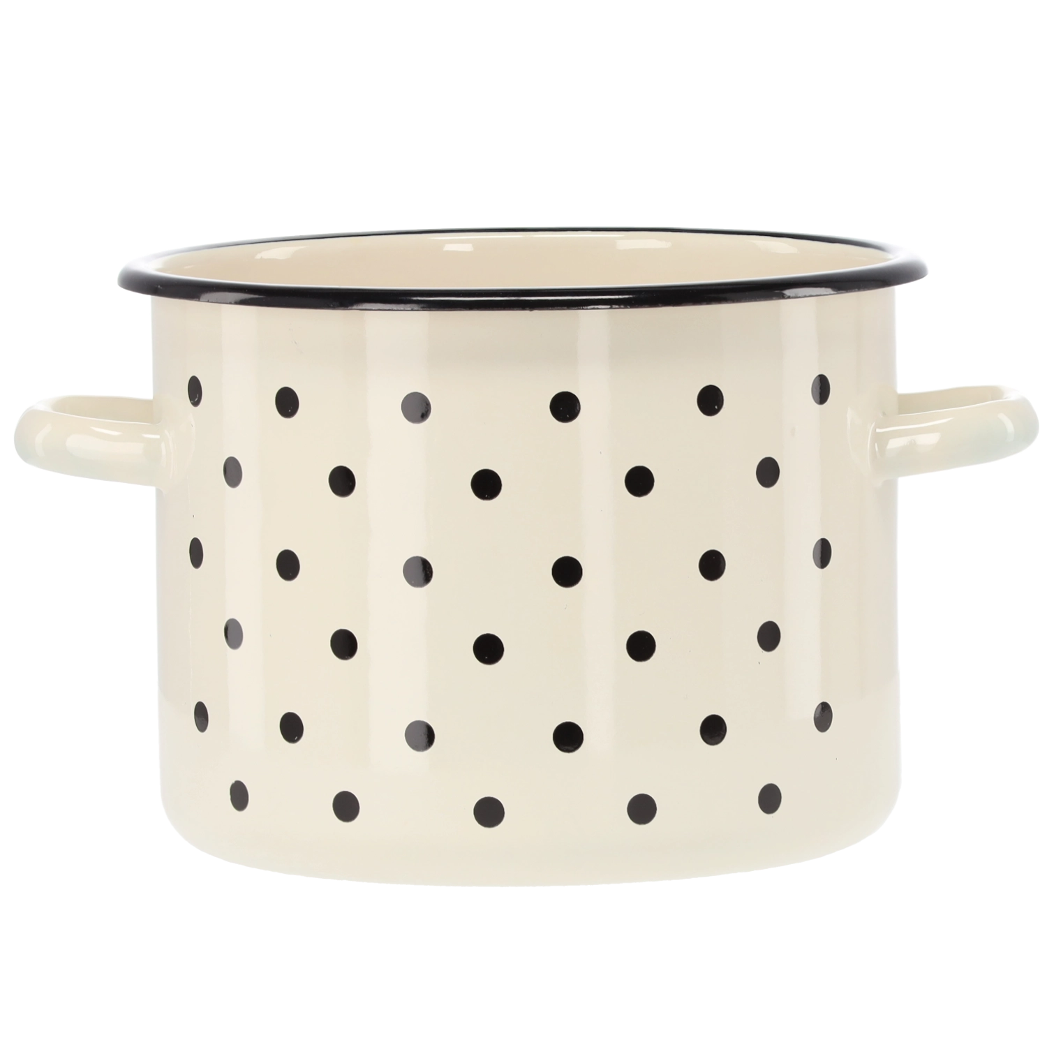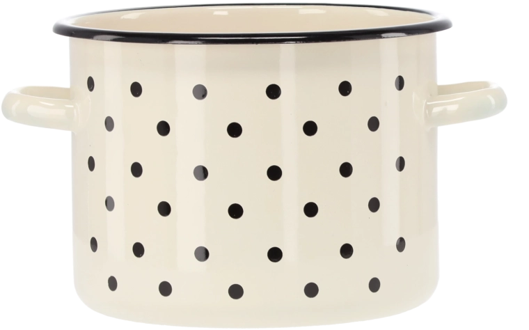Ten praktyczny emaliowany garnek łączy ponadczasowy design z wysoką wytrzymałością. Biały kolor z delikatnym wzorem w kropki doda Twojej kuchni świeżego wyglądu, a wysokiej jakości emalia zapewni równomierne nagrzewanie i długą żywotność.