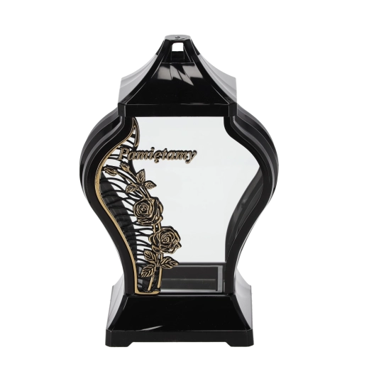 Designerski lampion w czarno‑złotej odsłonie z dyskretnym motywem pnącej róży to idealny wybór dla osób szukających eleganckiej i gustownej ozdoby na grób. Wysokość 30 cm zapewnia dobrą widoczność i stabilność, a ponadczasowe zestawienie kolorów podkreśla godny charakter miejsca ostatniego spoczynku.