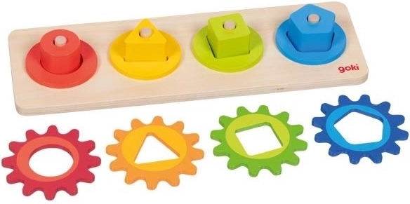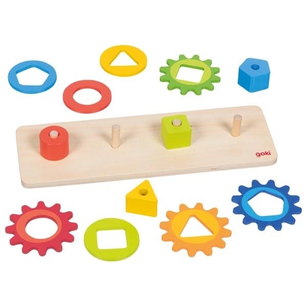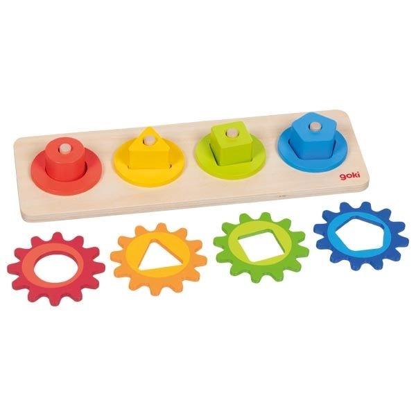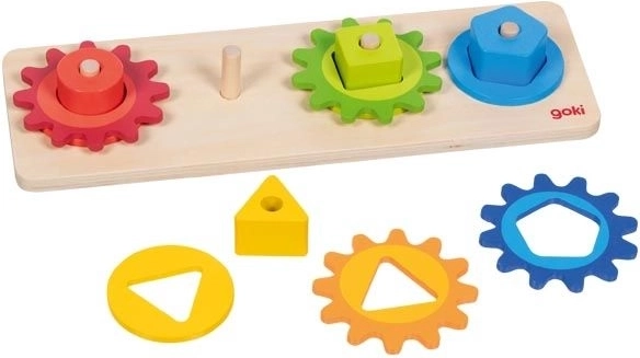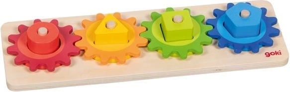 Ta drewniana zabawka motoryczna łączy wkładanie i sortowanie kolorowych kształtów z obracaniem połączonych kół zębatych. Podczas zabawy dzieci w naturalny sposób poznają zasadę przyczyny i skutku – poruszą jednym kółkiem, a pozostałe zaczynają się kręcić. W atrakcyjny sposób rozwijają zręczność, cierpliwość i percepcję przestrzenną.