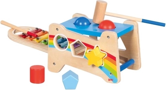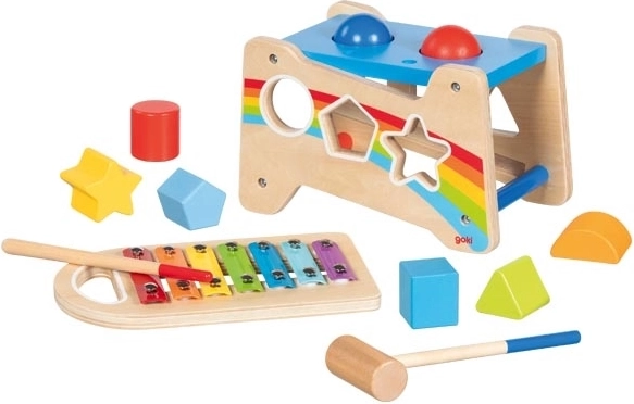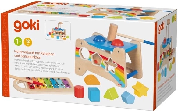 Ta sprytna zabawka Goki wspiera dzieci w odkrywaniu świata kształtów, kolorów i dźwięków. Młotek do wbijania z dwiema kulkami gwarantuje radość z działania, wsuwany ksylofon zamienia zabawę w mały koncert, a sorter kształtów ćwiczy logikę i koordynację ręka–oko. Dzięki kompaktowym wymiarom świetnie sprawdzi się w pokoju dziecięcym i w podróży.