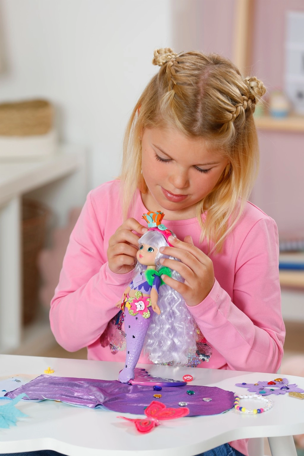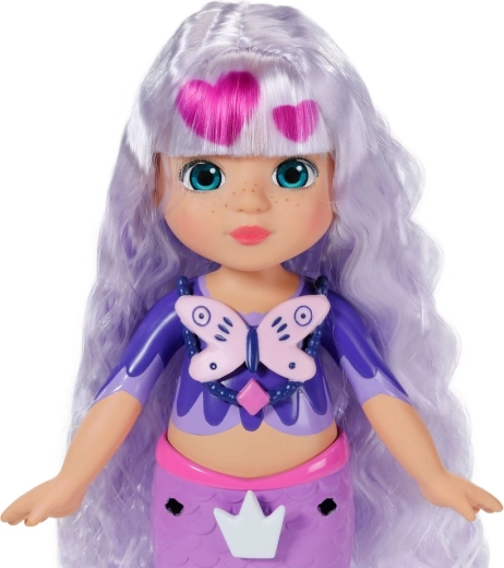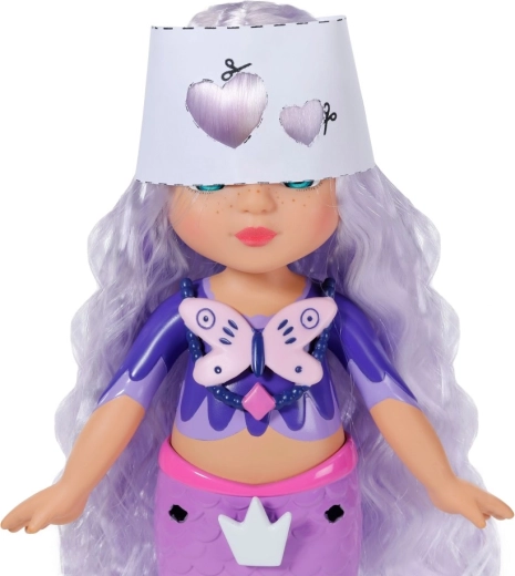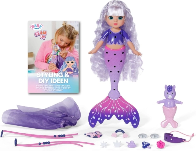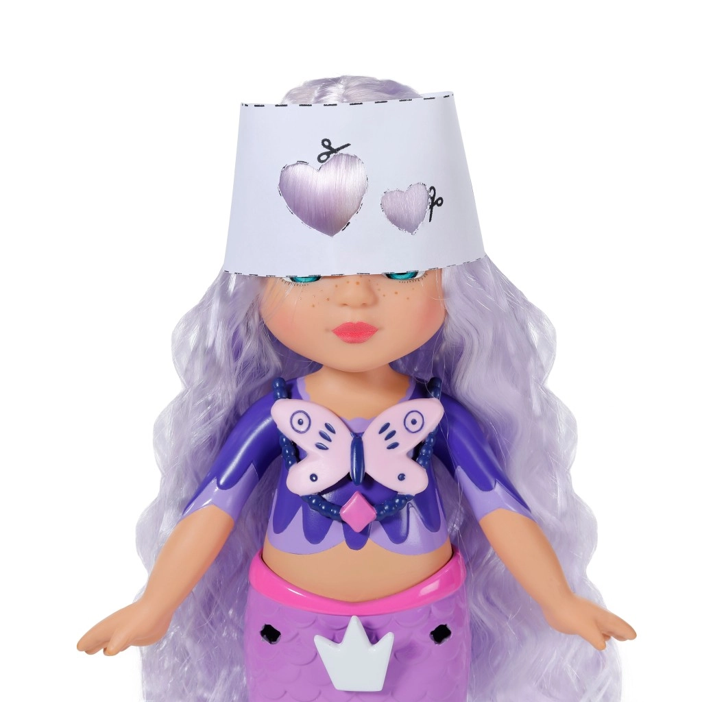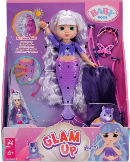 Odkryj świat kreatywności z lalką BABY born syrena Aura z linii Glam Up. Dzięki magicznemu efektowi UV jej długie fioletowe włosy na słońcu zmieniają kolor, a Ty możesz je czesać, ozdabiać i stylizować od głowy aż po płetwę. W zestawie znajdziesz tekstylne akcesoria, kolorowe przypinane ozdoby, uroczego zwierzęcego przyjaciela oraz dzienniczek pełen inspiracji – każdego dnia powstaje nowy, oryginalny look.