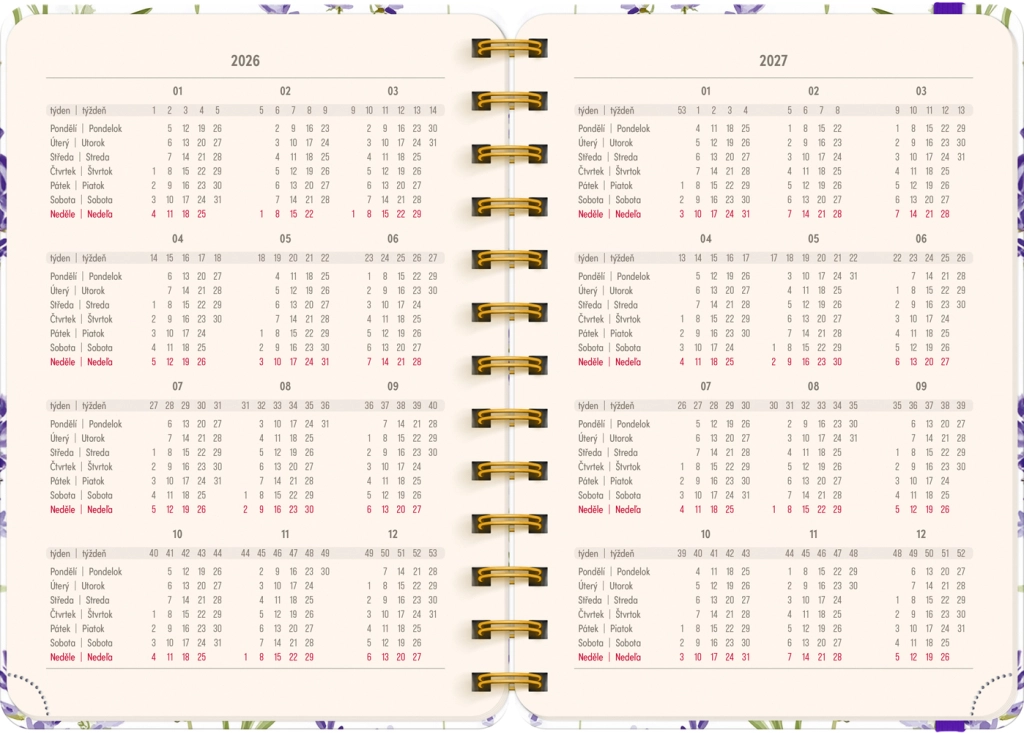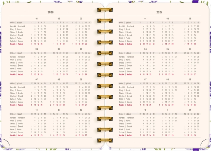 Czesko‑słowackie tygodniowe kalendarium liniowe z imieninami i świętami ułatwia organizację czasu w pracy i w domu. Każdy tydzień oferuje wydzieloną przestrzeń na notatki, zadania lub ważne terminy, a roczne przeglądy 2026 i 2027 zapewniają szybkie rozeznanie w dłuższym horyzoncie.