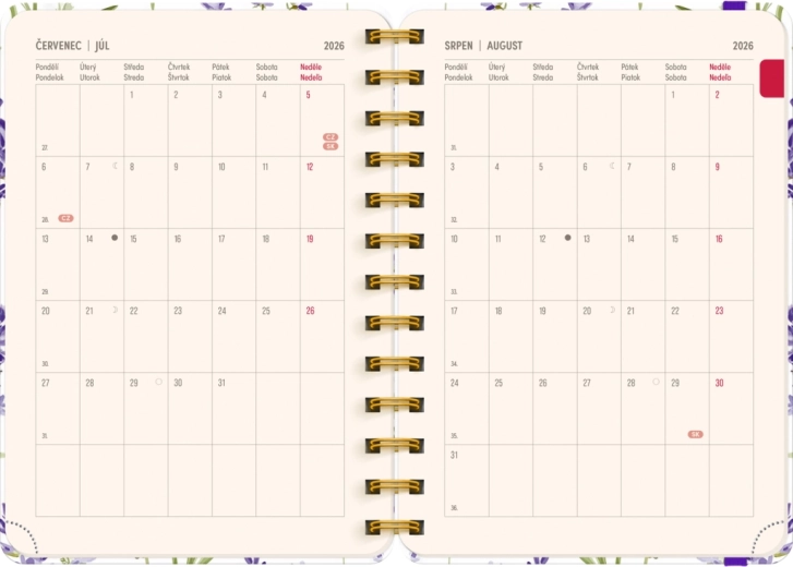 Elegancki 18‑miesięczny terminarz Petito w motywie lawendy łączy przejrzystość i styl do planowania od lipca 2026 do grudnia 2027. Oferuje tygodniowe kalendarium liniowe z czeskimi i słowackimi imieninami oraz świętami, miesięczne przeglądy na lata 2026 i 2027 oraz dużo miejsca na notatki w każdym tygodniu.