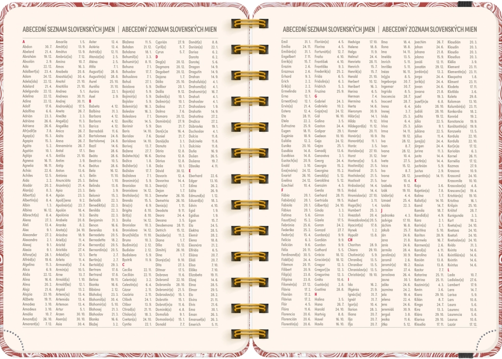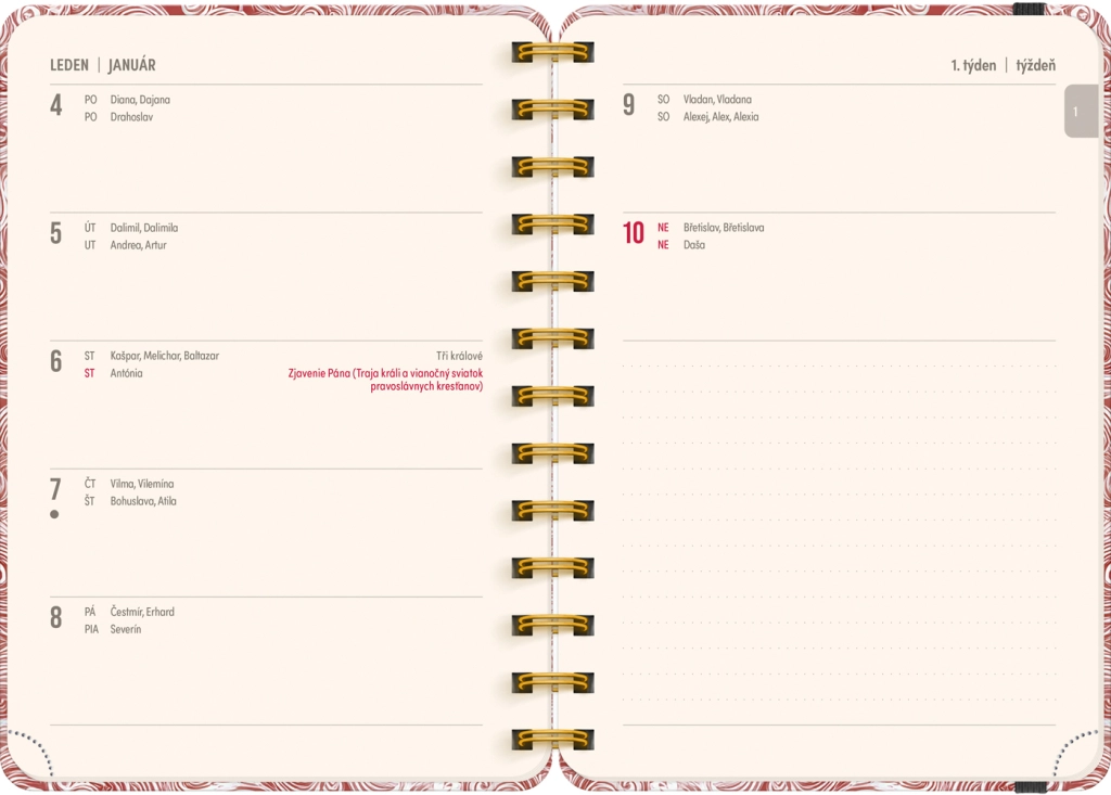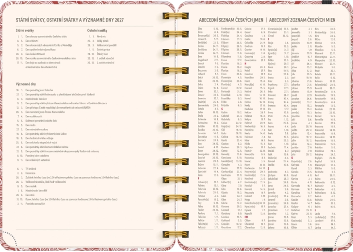 - Tygodniowe kalendarium liniowe: czesko‑słowackie, z imionami i świętami