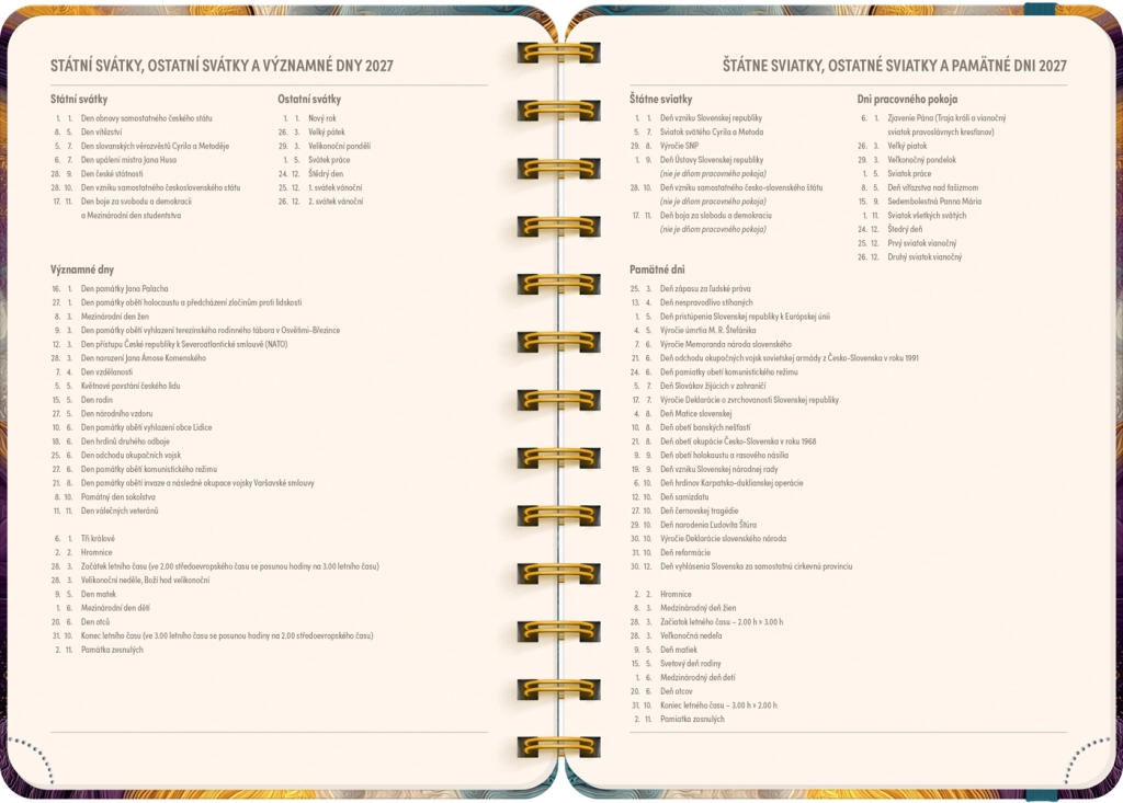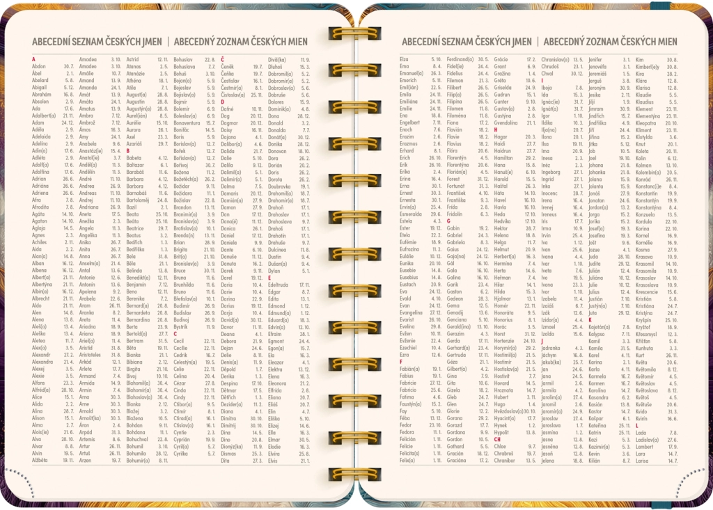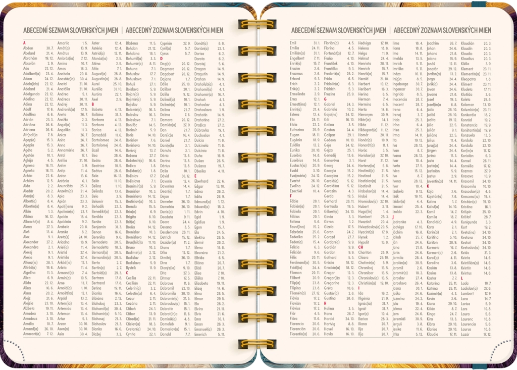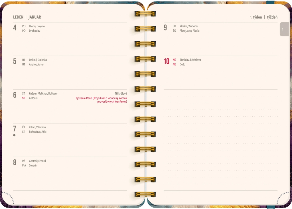 Kalendarium jest czesko‑słowackie, przejrzyste i uzupełnione o listy imion, dzięki czemu zawsze będziesz mieć pod ręką święta i imieniny. Każdy tydzień zawiera wydzielone miejsce na notatki, aby zapisywać priorytety, zadania i ważne terminy.