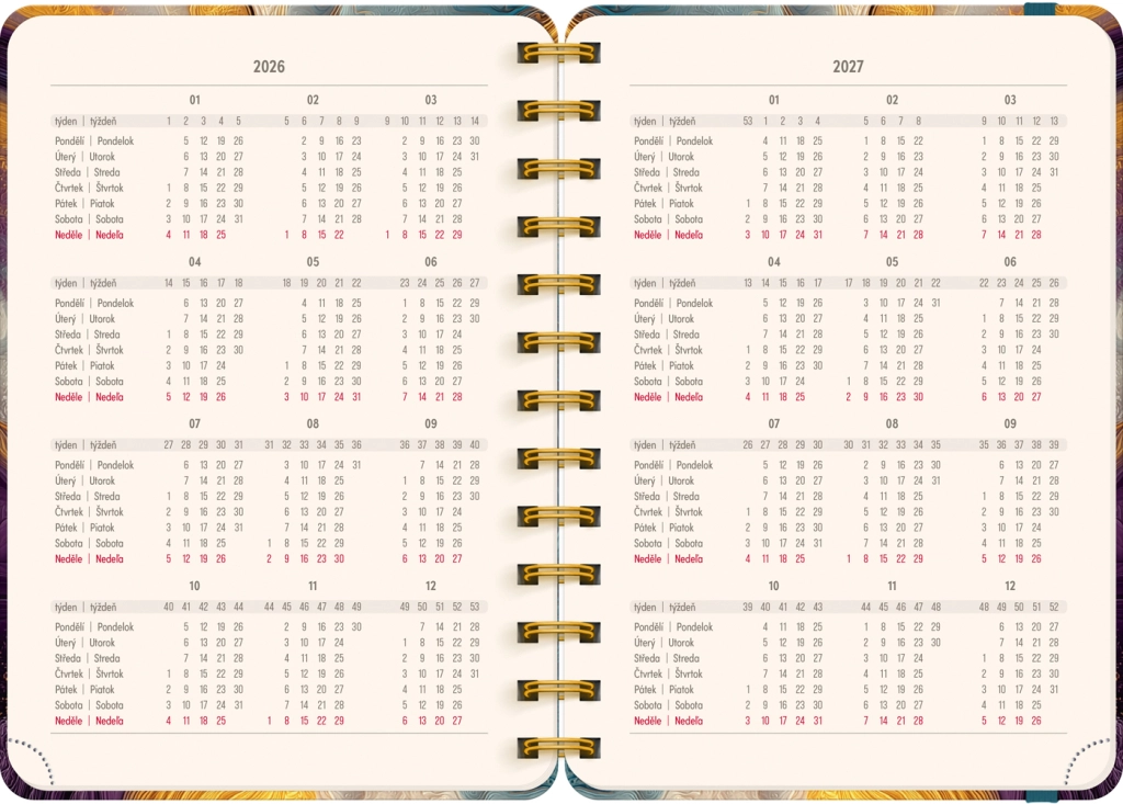 Praktyczny 18‑miesięczny planer w formacie 13 × 18 cm łączy elegancki motyw kolorowego agatu z przejrzystym tygodniowym planowaniem. Oferuje czesko‑słowackie kalendarium liniowe z imieninami i świętami, miejsce na notatki w każdym tygodniu oraz przegląd na lata 2026 i 2027. Zaczyna się w lipcu 2026 i kończy w grudniu 2027.