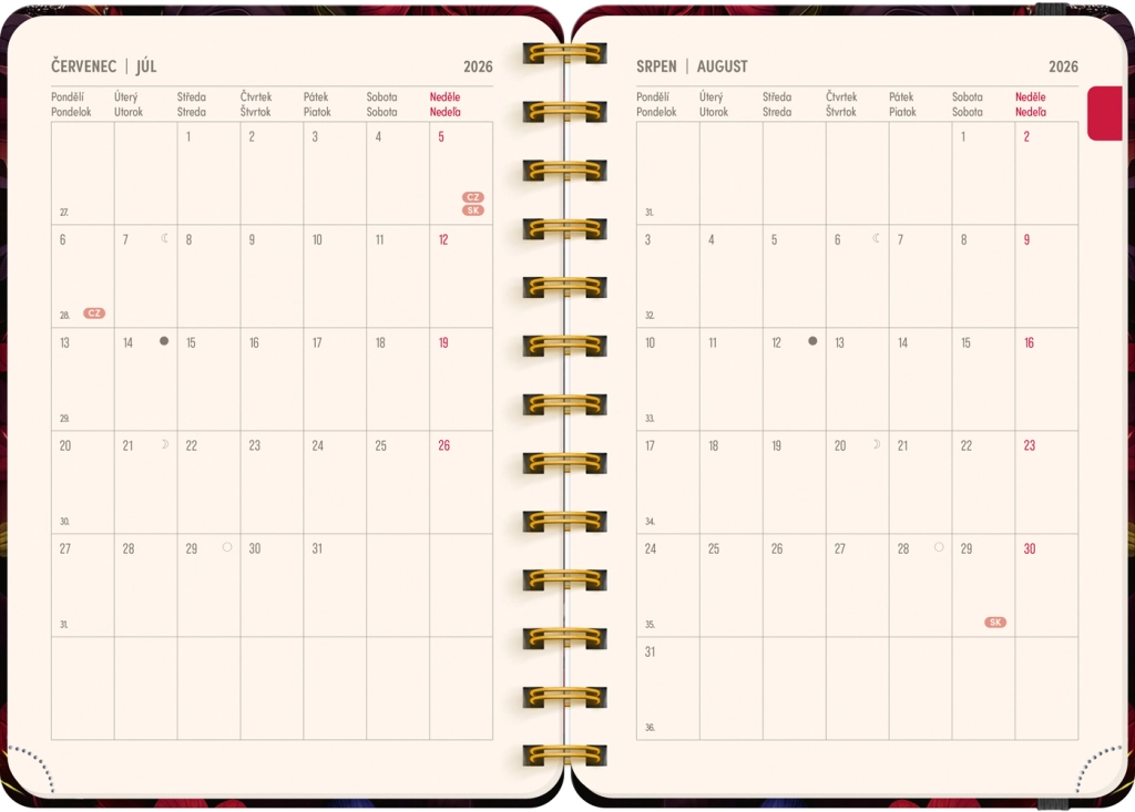 Terminarz obejmuje okres od lipca 2026 do grudnia 2027 i oferuje wszystko, czego oczekujesz od codziennego planera: szybkie roczne przeglądy, miejsce na notatki oraz czytelnie podzielone tygodnie. Kompaktowy format 13 × 18 cm zmieści się do torebki i plecaka, więc planowanie masz zawsze pod ręką.