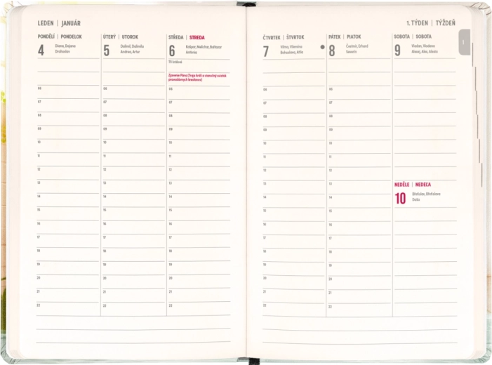 - Tygodniowe, kolumnowe, czesko‑słowackie z imionami i świętami