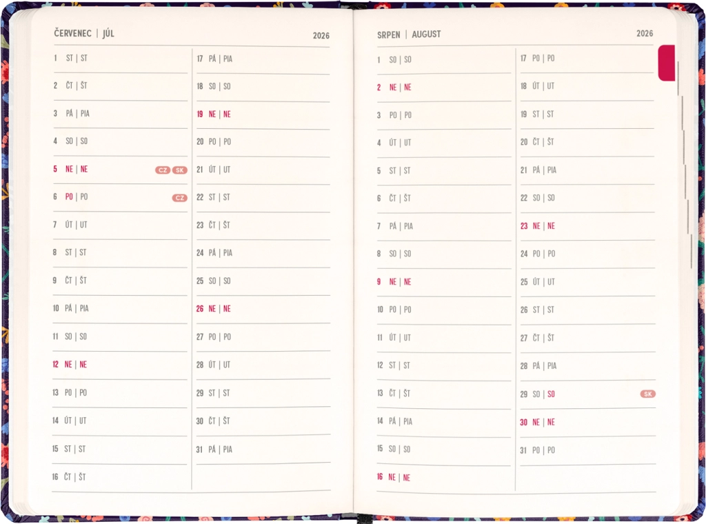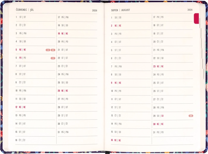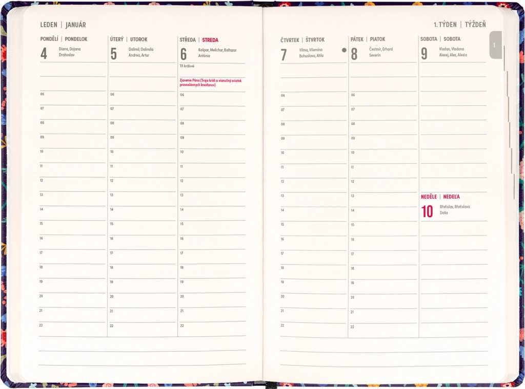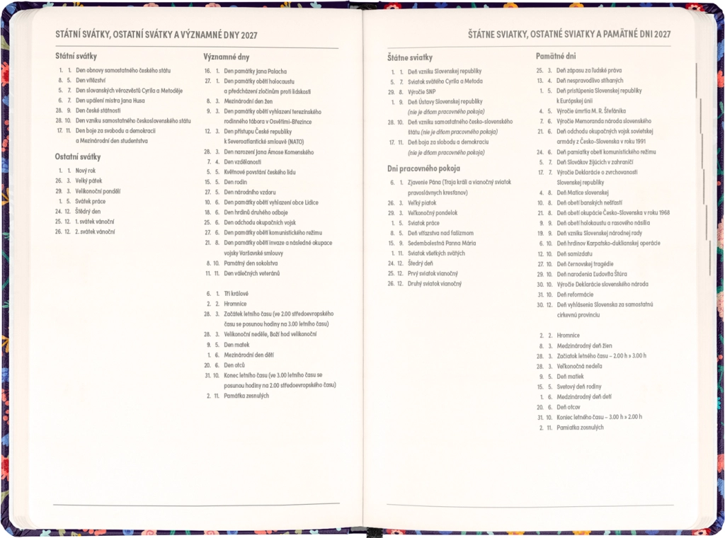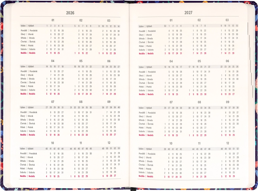 Stylowy terminarz Notique Petito Flora łączy praktyczny układ tygodni w kolumnach z subtelnym kwiatowym designem. Dzięki przeglądom na lata 2026 i 2027 oraz wykazowi czeskich i słowackich imion będziesz mieć święta i plany zawsze pod ręką.